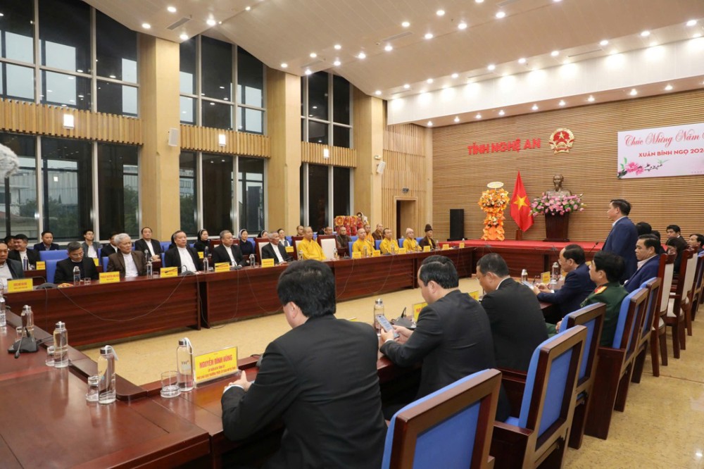 Đáp từ, Bí thư Tỉnh ủy Nguyễn Khắc Thận thông tin về những kết quả nổi bật của tỉnh trong năm 2025, nhấn mạnh sự đóng góp tích cực của các tổ chức tôn giáo trong các hoạt động an sinh xã hội, đặc biệt là chương trình xóa nhà tạm, nhà dột nát cho người dân và các hoạt động chăm lo Tết cho người nghèo, người yếu thế. Bí thư Tỉnh ủy ghi nhận và trân trọng cảm ơn sự đồng hành của Ban Trị sự GHPGVN tỉnh Nghệ An và Tòa Giám mục Giáo phận Vinh, đồng thời mong muốn trong thời gian tới các tổ chức tôn giáo tiếp tục phối hợp, vận động tín đồ tham gia tích cực các phong trào thi đua yêu nước, góp phần xây dựng tỉnh Nghệ An ngày càng phát triển. Nhân dịp Xuân Bính Ngọ 2026, Bí thư Tỉnh ủy gửi lời chúc năm mới mạnh khỏe, hạnh phúc đến các vị chức sắc, tu sĩ, đồng bào Công giáo và Phật tử trong toàn tỉnh.