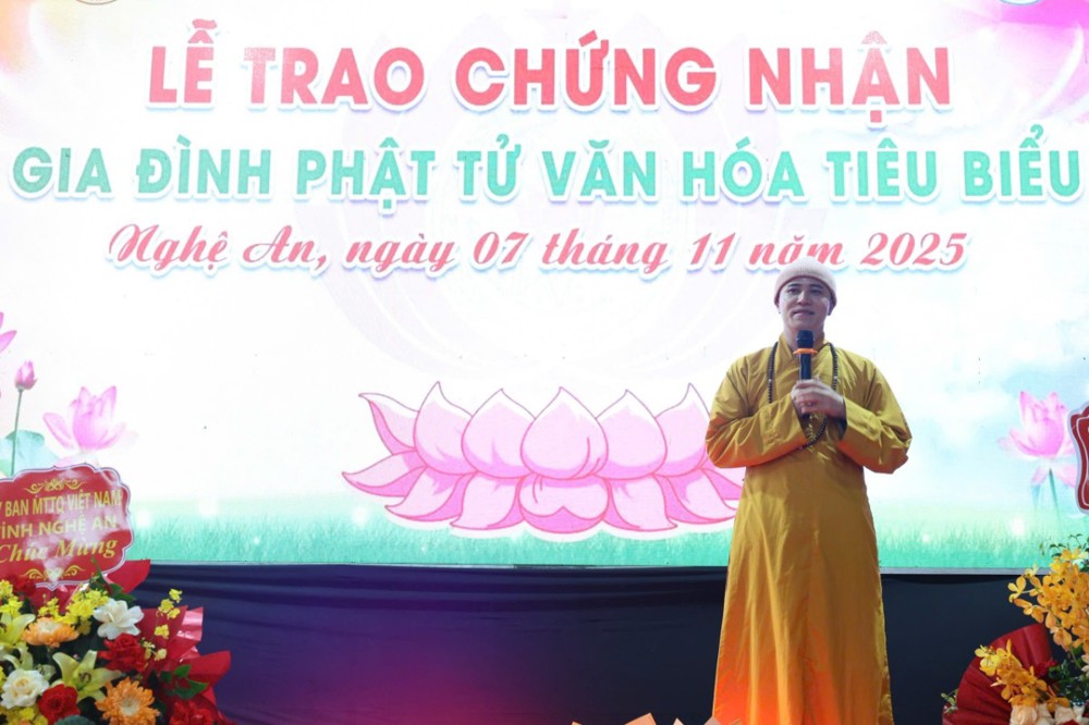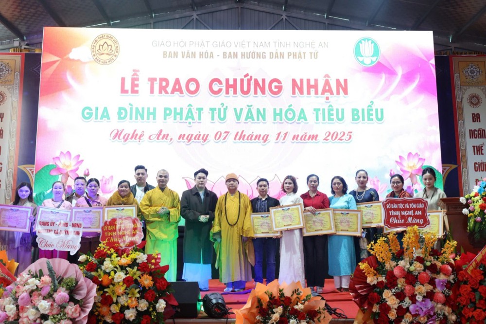 PSO - Trong khuôn khổ Lễ hội Quán Âm Nam Hải, chiều ngày 7/11/2025, Ban Hướng dẫn Phật tử và Ban Văn hóa Giáo hội Phật giáo Việt Nam tỉnh Nghệ An đã long trọng tổ chức Lễ trao chứng nhận Gia đình Phật tử Văn hóa tiêu biểu giai đoạn 2023 – 2025 tại chùa An Thái, xã Quỳnh Phú, huyện Quỳnh Lưu.