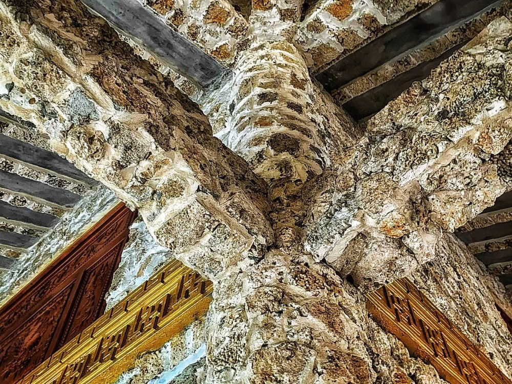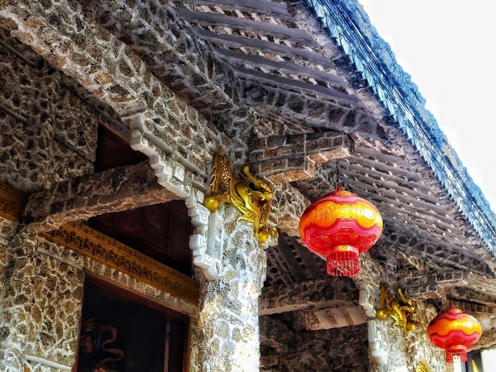 Theo ông Bảy, phần mái chùa được thực hiện rất công phu để tạo nên độ cong mềm mại và tự nhiên. Phần mái ngoài cũng được ốp san hô, qua sương gió của thời gian tạo nên bức rêu phong cổ kính. Các bức tường được ốp bằng san hô, gáo dừa thay cho gỗ. Màu nâu, đen, trắng của gáo dừa và san hô kết hợp lại với nhau tạo nên nét đẹp đặc trưng, màu sắc riêng biệt mà ít ngôi chùa nào ở Việt Nam có được.