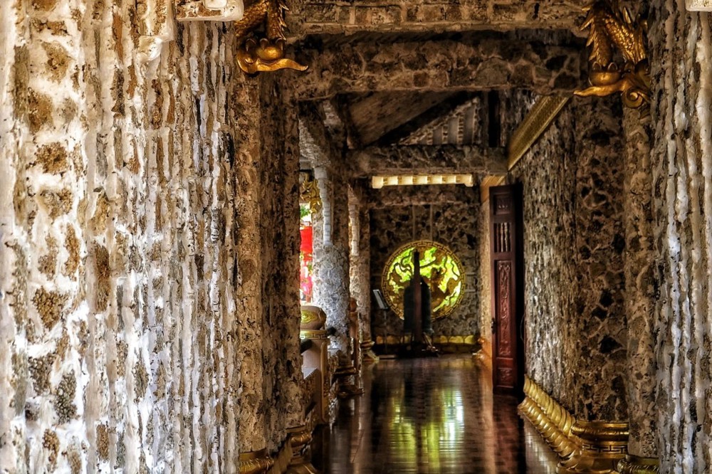 "Chúng tôi không dùng màu sơn vì chùa ở sát biển, sơn rất nhanh bị xuống màu. Còn san hô có màu trắng nguyên thủy, cho dù bị ảnh hưởng của không gian, thời gian, nhất là sự ăn mòn của hơi biển vẫn luôn bền màu và chắc chắn. Khi kết hợp cùng xi măng trắng sẽ tạo nên một bức họa độc đáo và lạ mắt. Hiện tại khu tăng xá của chùa cũng đã được chúng tôi trang trí bằng phương pháp ốp san hô như ở chính điện", ông Bảy nói.