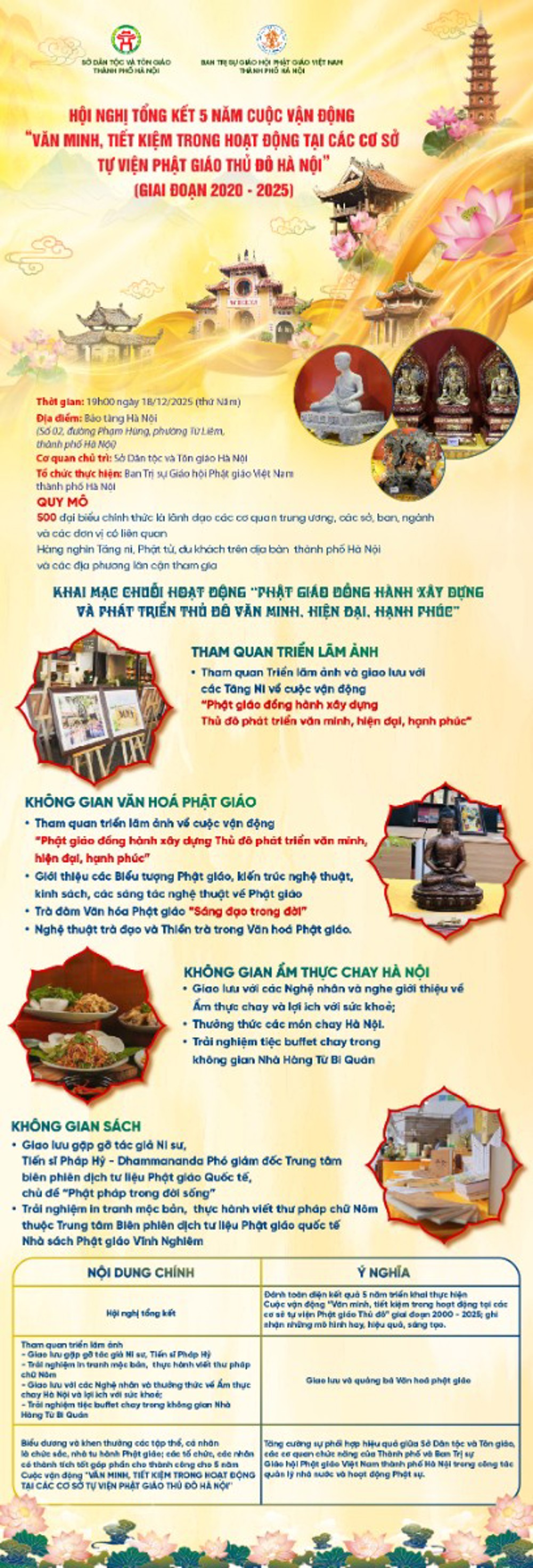 Hội nghị Tổng kết 05 năm thực hiện Cuộc vận động “Văn minh, tiết kiệm trong hoạt động tại các cơ sở tự viện Phật giáo Thủ đô Hà Nội” (giai đoạn 2020 – 2025) được Sở Dân tộc và Tôn giáo thành phố Hà Nội phối hợp với Ban Trị sự Giáo hội Phật giáo Việt Nam (GHPGVN) thành phố Hà Nội tổ chức tại Bảo tàng Hà Nội, vào ngày 18 và 19 tháng 12 năm 2025.