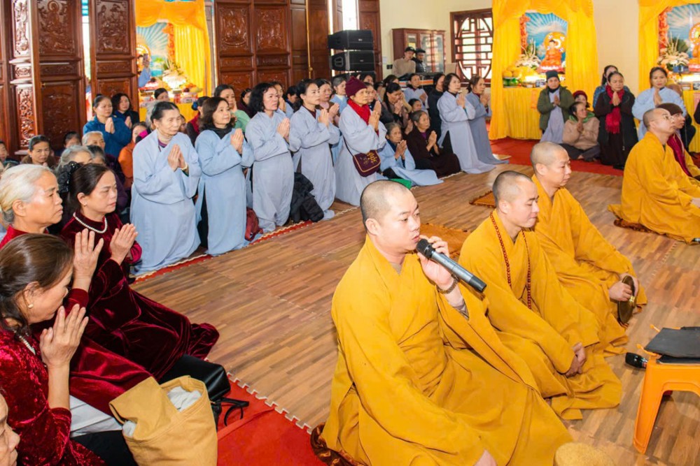 Tiếp đó, Đại đức Thích Thanh Luật – Trụ trì chùa, đã đại lao chư Tôn đức Tăng Ni hiện tiền, chủ sám khóa lễ tụng tán thán công đức chư Phật nhân ngày thành đạo; phục nguyện cầu quốc thái dân an, mưa thuận gió hòa, xã hội phồn vinh, chúng sinh dị độ; đồng thời cử hành nghi thức thiền hành nhiễu Phật trong chánh niệm tỉnh thức.