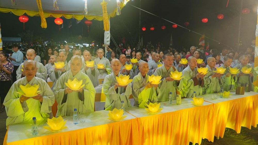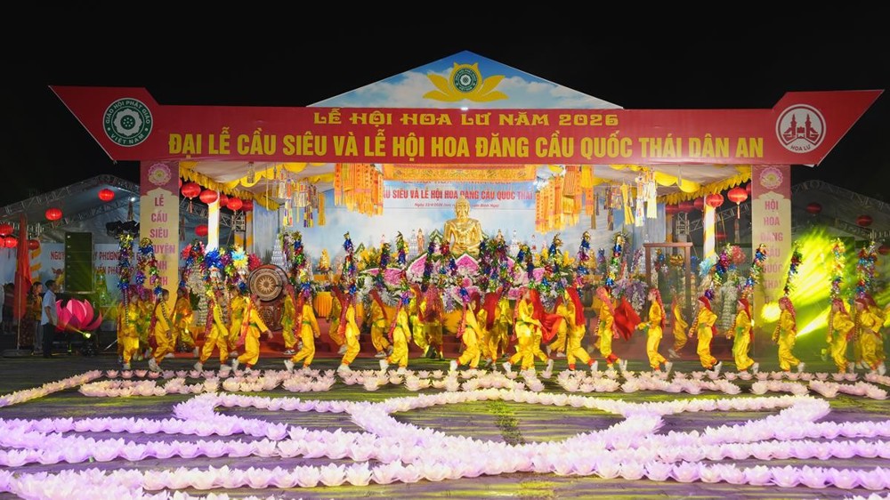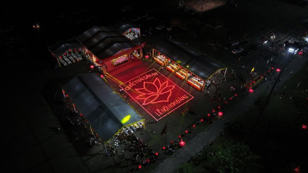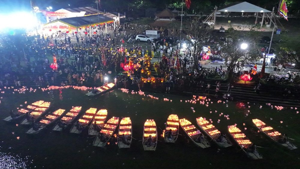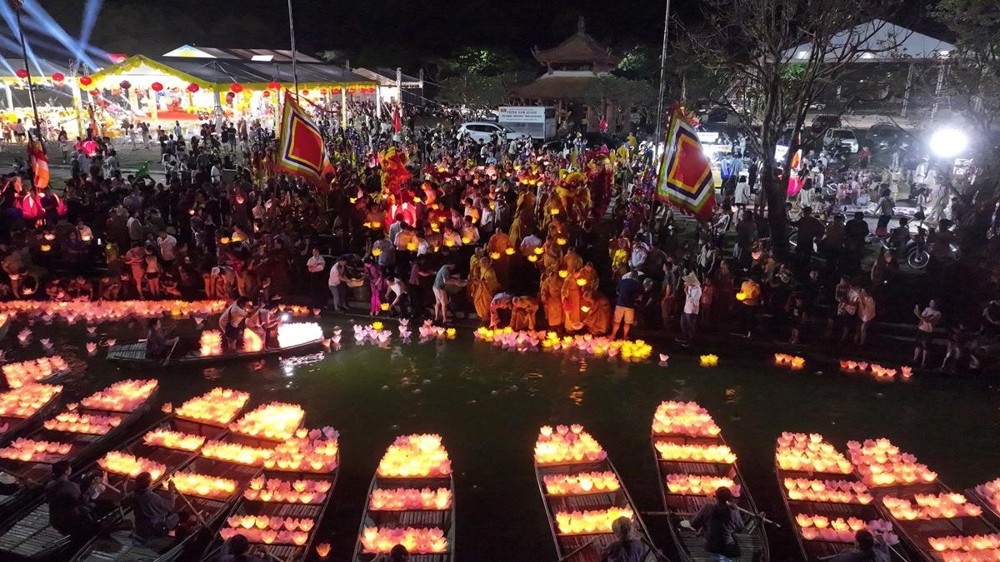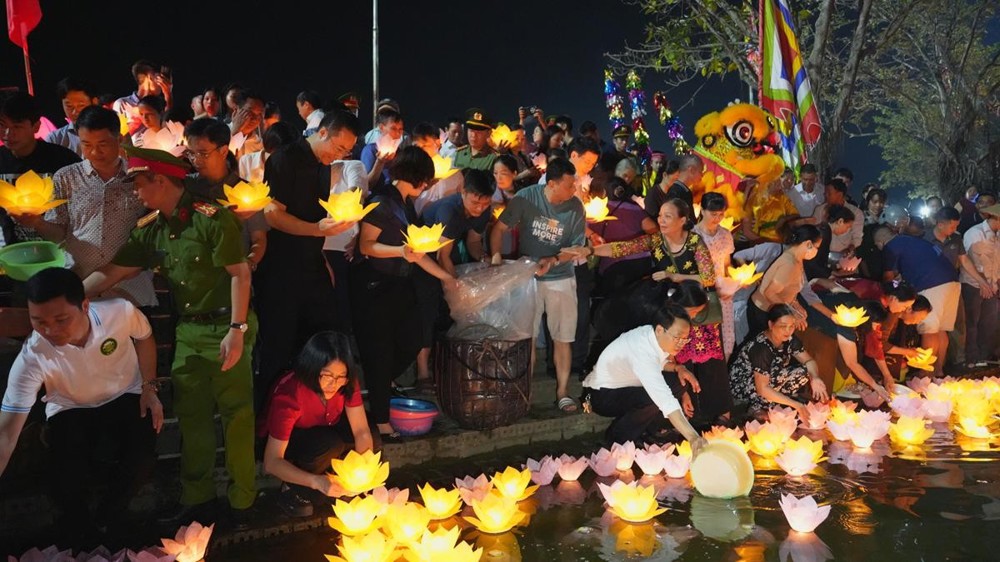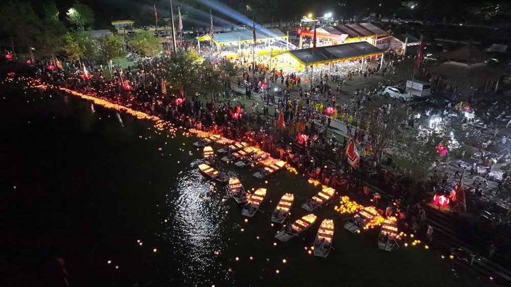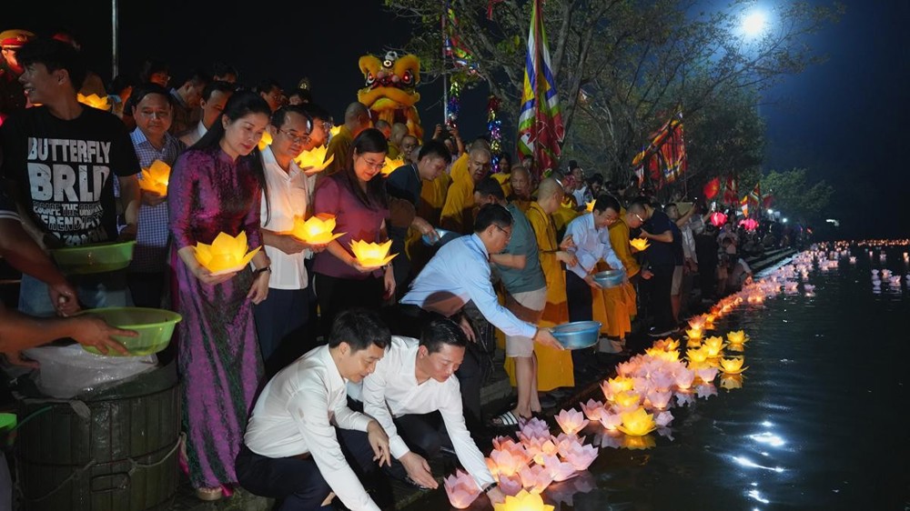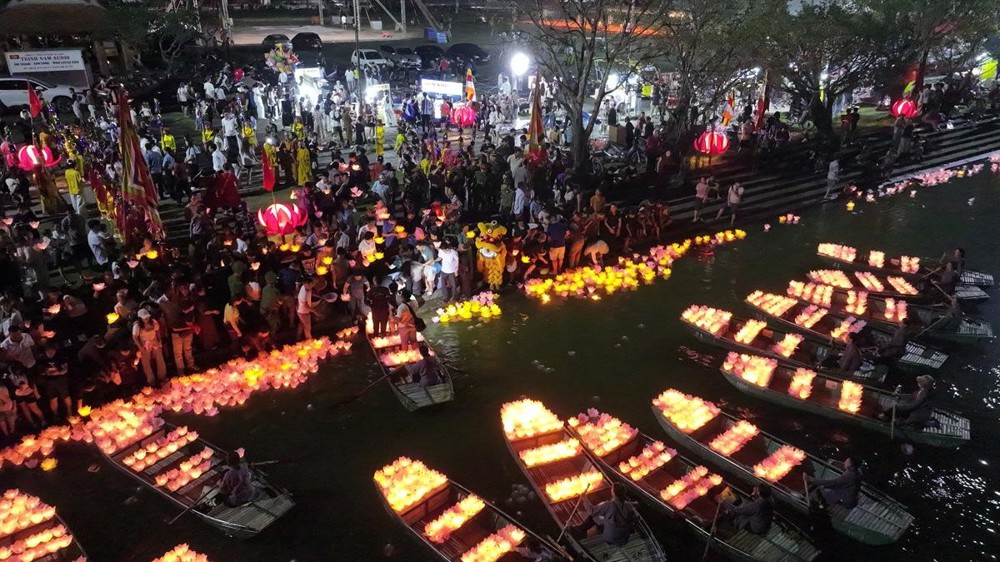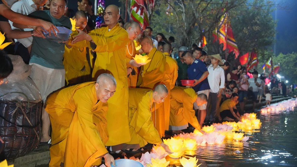 Trong khoảnh khắc trang nghiêm, hàng nghìn hoa đăng được thắp sáng và thả trên dòng nước, kết thành dải ánh sáng lung linh, huyền ảo. Mỗi ngọn đèn là một lời nguyện ước hướng về cội nguồn, lan tỏa niềm tin vào những giá trị thiện lành, hòa bình và hạnh phúc.