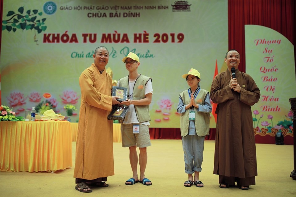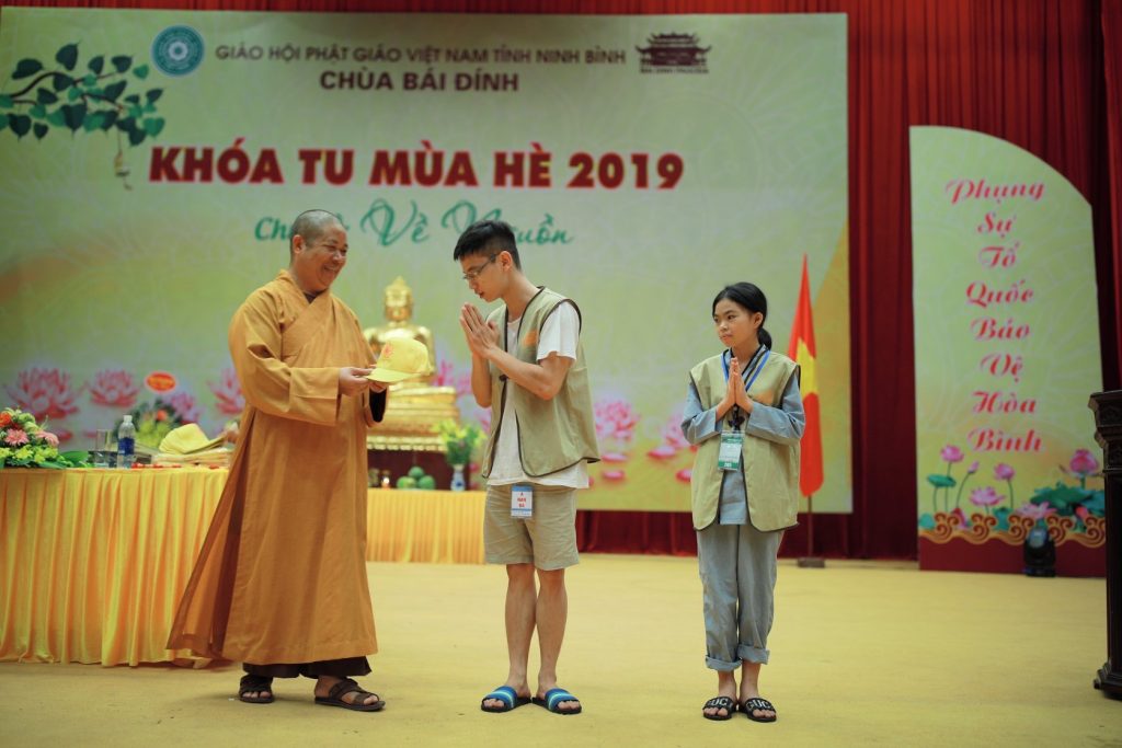 Thượng toạ đã có những câu hỏi Phật pháp để các bạn cùng được tương tác trực tiếp với TT. TT giới thiệu cho các bạn khoá sinh biết đến hơn nguồn gốc, lịch sử Đức Phật Thích Ca Mâu Ni. Đồng thời TT cũng giới thiệu, giải nghĩa cuốn kinh “Chuyển Pháp Luân” và đây là cuốn kinh đầu tiên được TƯ GHPG Việt Nam công nhận lấy quyển kinh này là kinh tụng thống nhất trong tất cả các sự kiện lớn của Phật giáo. TT cũng nhấn mạnh Bát chánh đạo cho tất cả khoá sinh được rõ hơn và thực tập trong quá trình tu học tại chùa Bái Đính cũng như sau này đó là: Tư duy chân chính, ngôn ngữ chân chính, hành động chân chính, sinh kế chân chính, chuyên cần chân chính, chú ý chân chính, định tâm chân chính và các bạn khoá sinh đồng hoà theo lời đọc của TT. Buổi chia sẻ khép lại, TT Thích Minh Quang, UV HĐTS GHPG VN, Phó VP 1 TƯ, Phó BTS GHPG VN tỉnh Ninh Bình kiêm Chánh Thư Ký, Phó trụ trì thường trực chùa Bái Đính, Trưởng BTC khoá tu đã lên nói lời tri ân đến TT Thích Thọ Lạc và cùng TT trao phần thưởng cho những bạn xuất sắc nhất. Sau đây là một số hình ảnh ghi nhận.