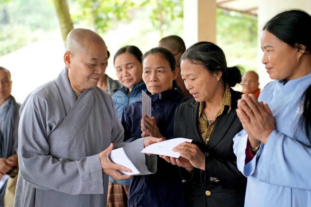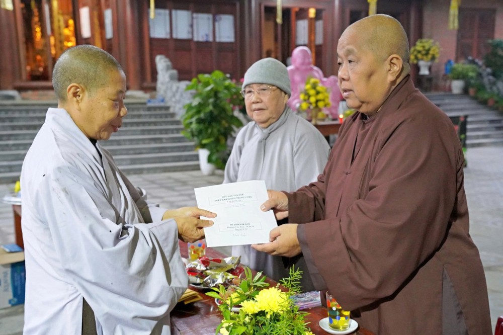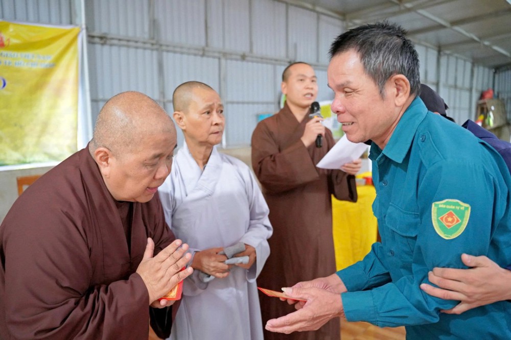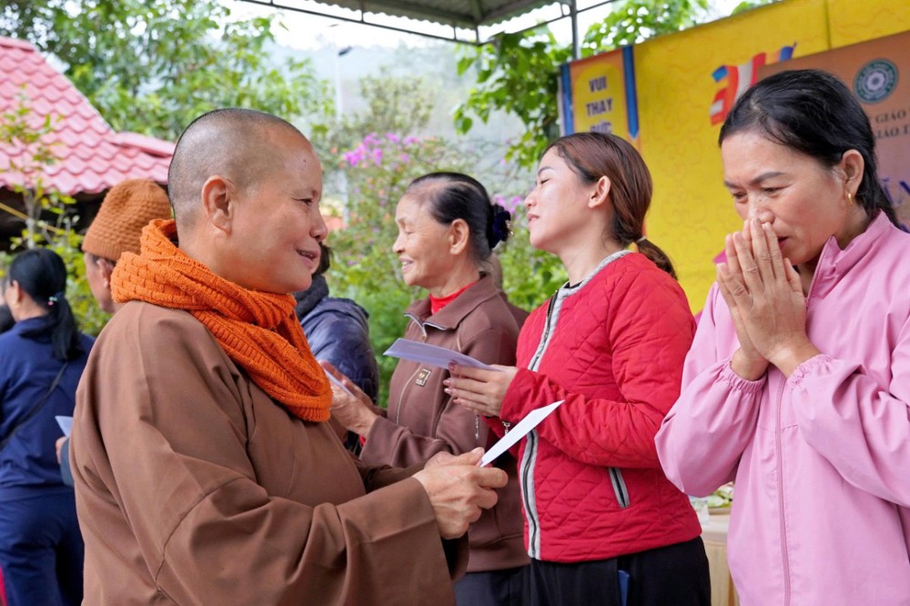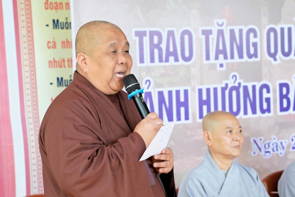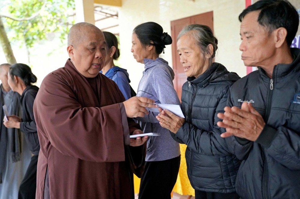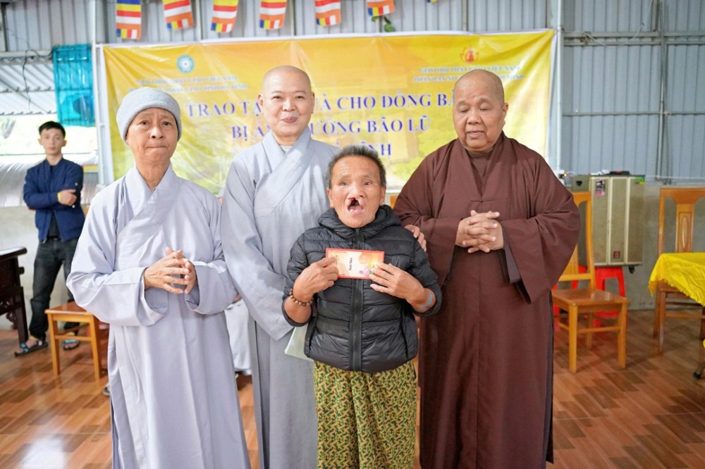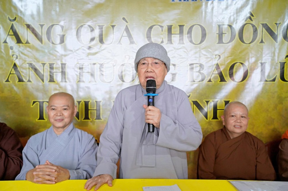 Tại mỗi điểm đến, Ni sư Thích Nữ Lệ Thuận – Phó Phân ban Ni giới Trung ương, Phó Phân ban Ni giới GHPGVN TP. Hồ Chí Minh, thay mặt đoàn ân cần thăm hỏi, động viên và khuyến tấn bà con Phật tử luôn giữ tâm bình an, tinh tấn niệm Phật để được chư Phật mười phương gia hộ, sớm vượt qua khó khăn sau thiên tai.