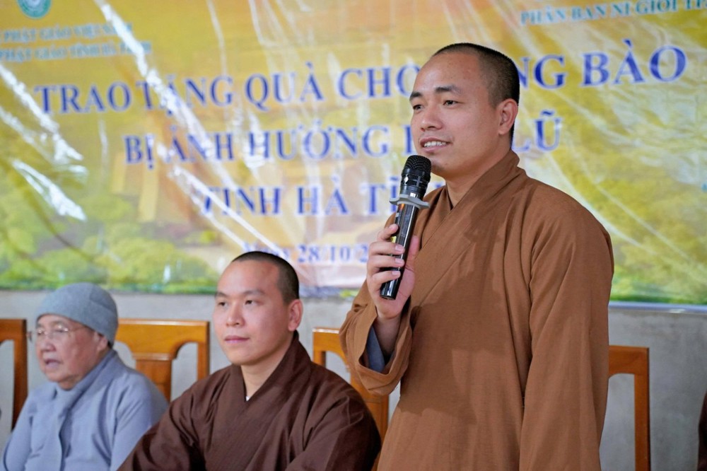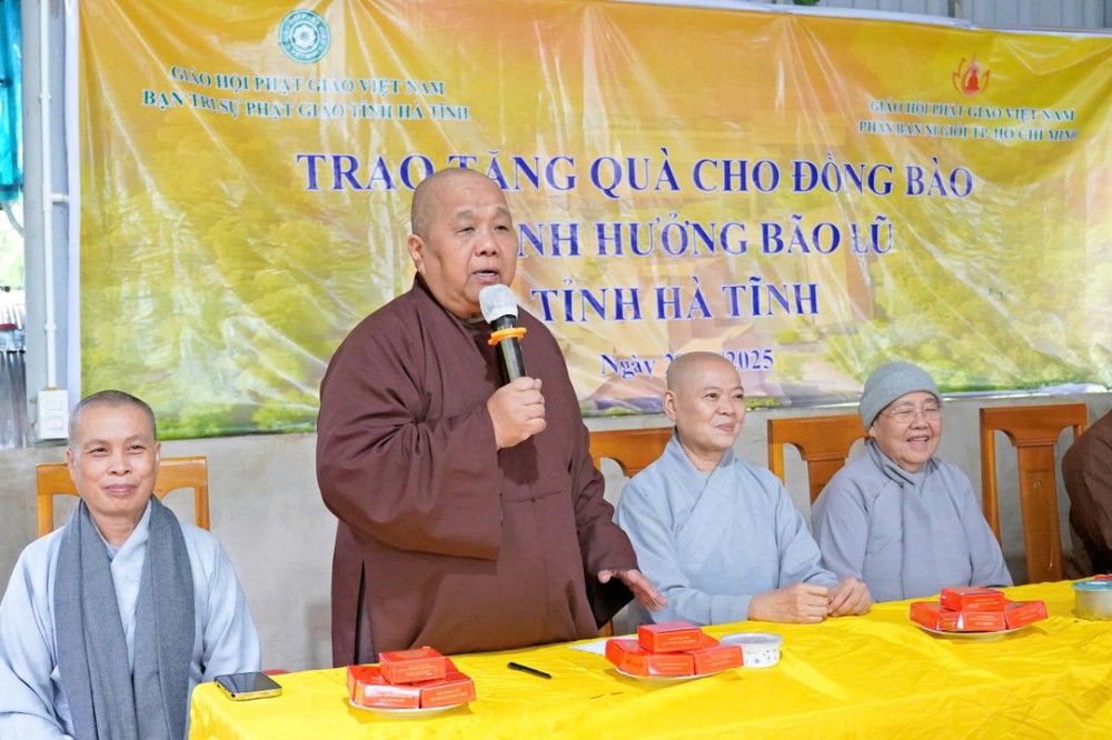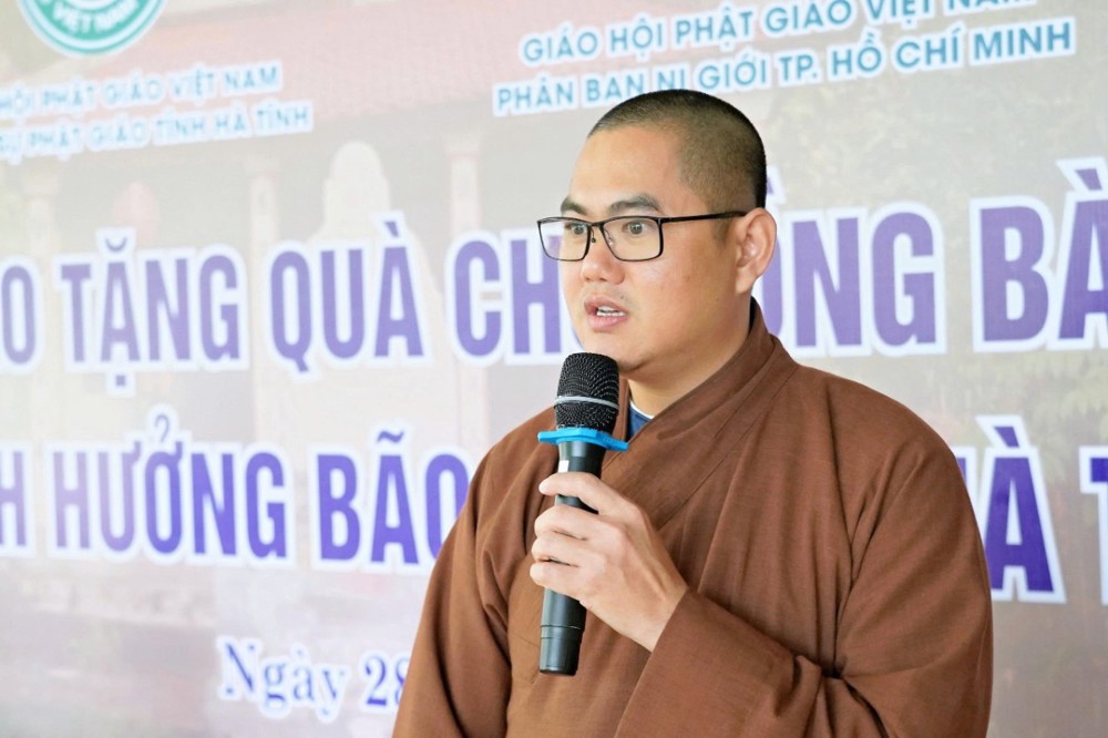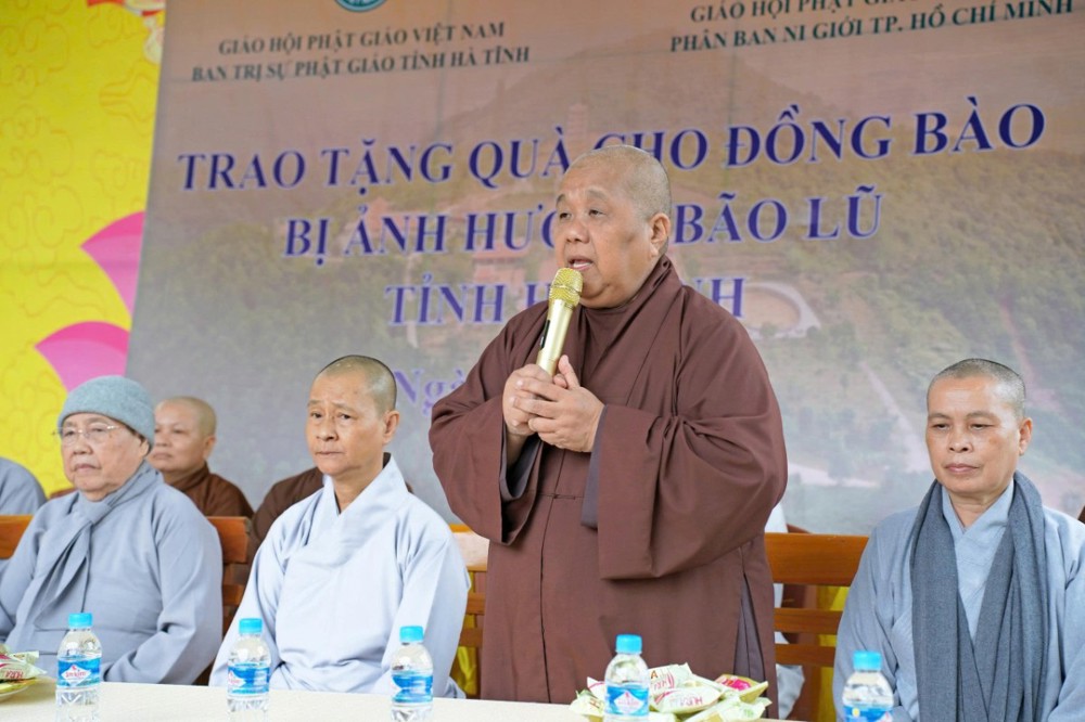 TT. Thích Tâm Phương, thay mặt HT. Thích Bảo Nghiêm – Phó Chủ tịch HĐTS, Trưởng ban Hoằng pháp Trung ương, Trưởng BTS GHPGVN tỉnh Hà Tĩnh, đã gửi lời tri ân sâu sắc đến Phân ban Ni giới TP. Hồ Chí Minh. Thượng tọa bày tỏ xúc động trước tấm lòng từ bi của chư Ni, dù tuổi cao nhưng vẫn không quản ngại đường xa, mang những phần quà thiết thực chia sẻ cùng bà con vùng bão lũ.