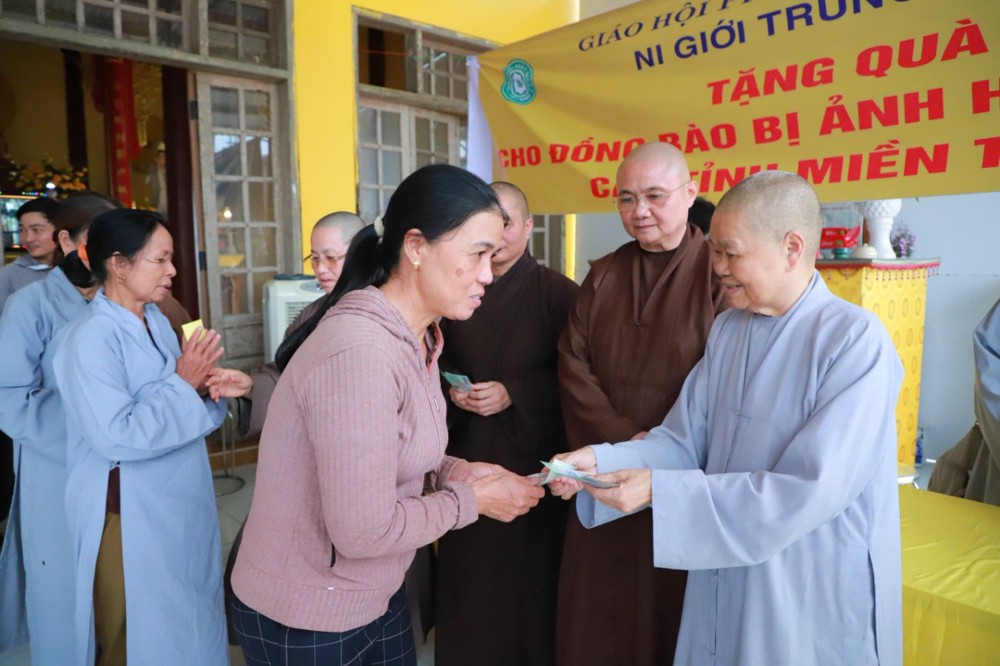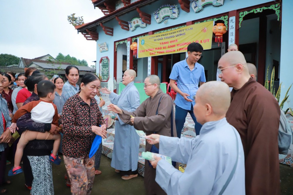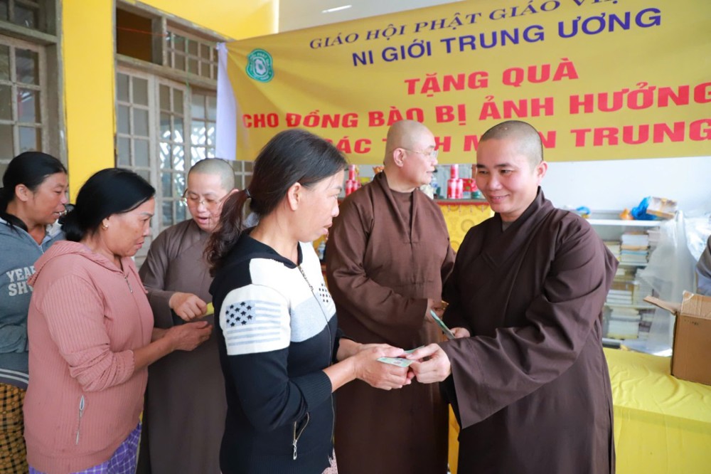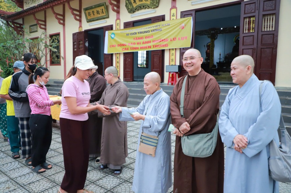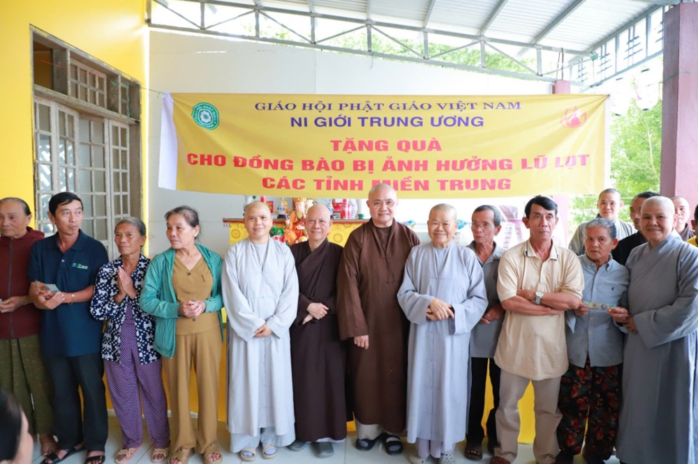 Đại diện đoàn PBNG TƯ, Ni sư Thích Nữ Chúc Tường đã thăm hỏi sức khỏe quý Ni trưởng, Ni sư tại địa phương; đồng thời gửi lời động viên đến bà con vùng bị thiên tai sớm vượt qua khó khăn, ổn định đời sống.