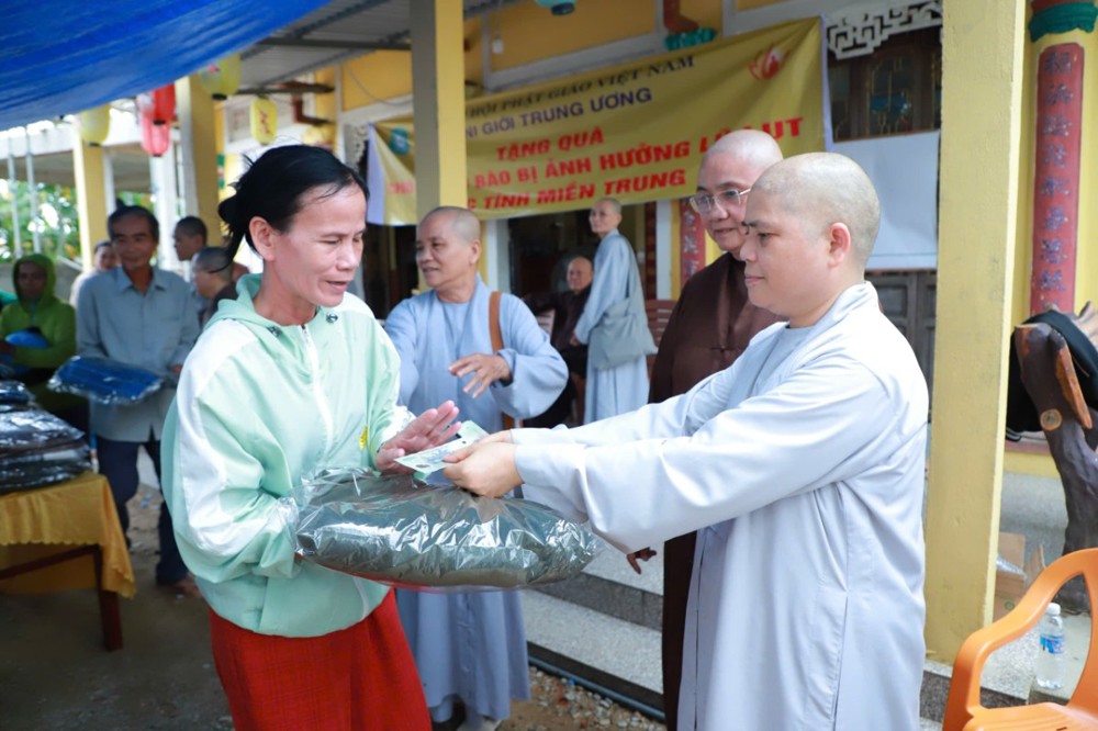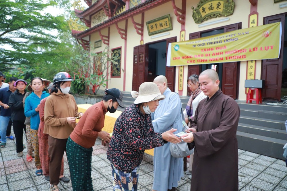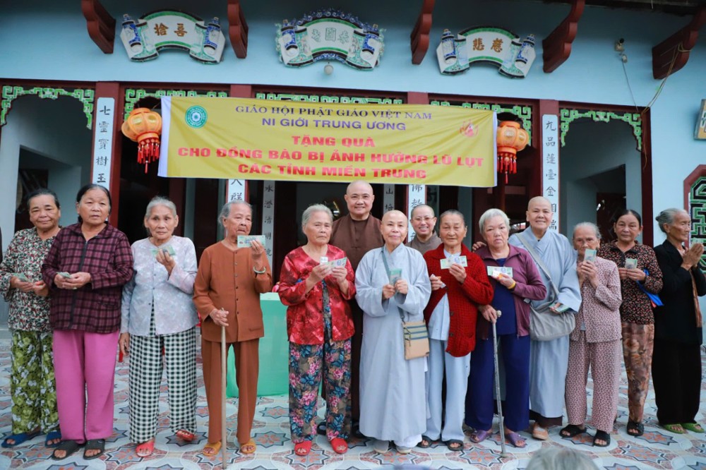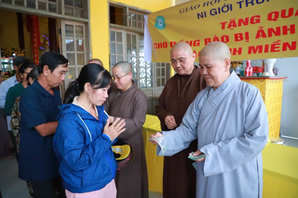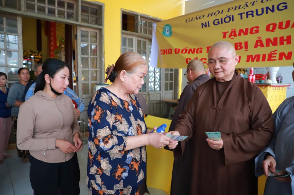 Đại diện đoàn PBNG TƯ, Ni sư Thích Nữ Chúc Tường đã thăm hỏi sức khỏe quý Ni trưởng, Ni sư tại địa phương; đồng thời gửi lời động viên đến bà con vùng bị thiên tai sớm vượt qua khó khăn, ổn định đời sống.