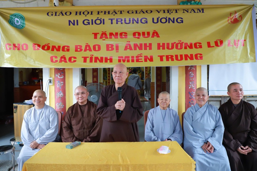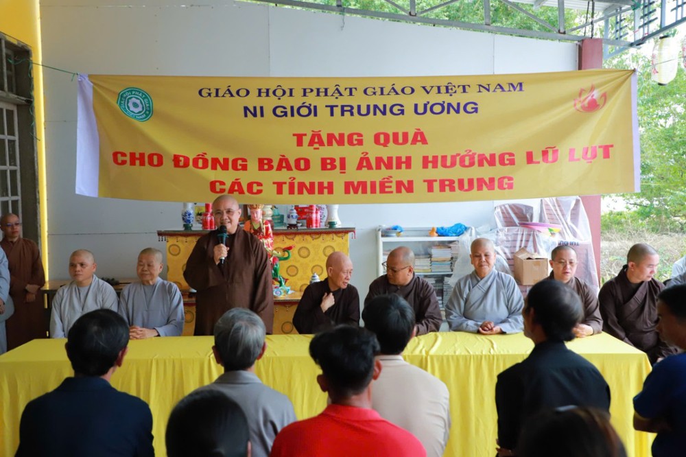 Phát biểu tại buổi cứu trợ, Ni trưởng Thích Nữ Như Minh gửi lời vấn an đến Ni trưởng Nhật Khương, đồng thời bày tỏ lòng cảm kích đến chư Ni và Phật tử khắp nơi đã chung lòng hướng về đồng bào miền Trung.