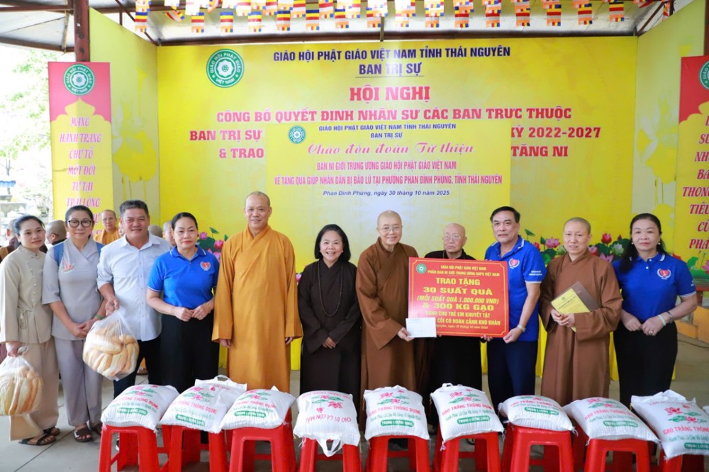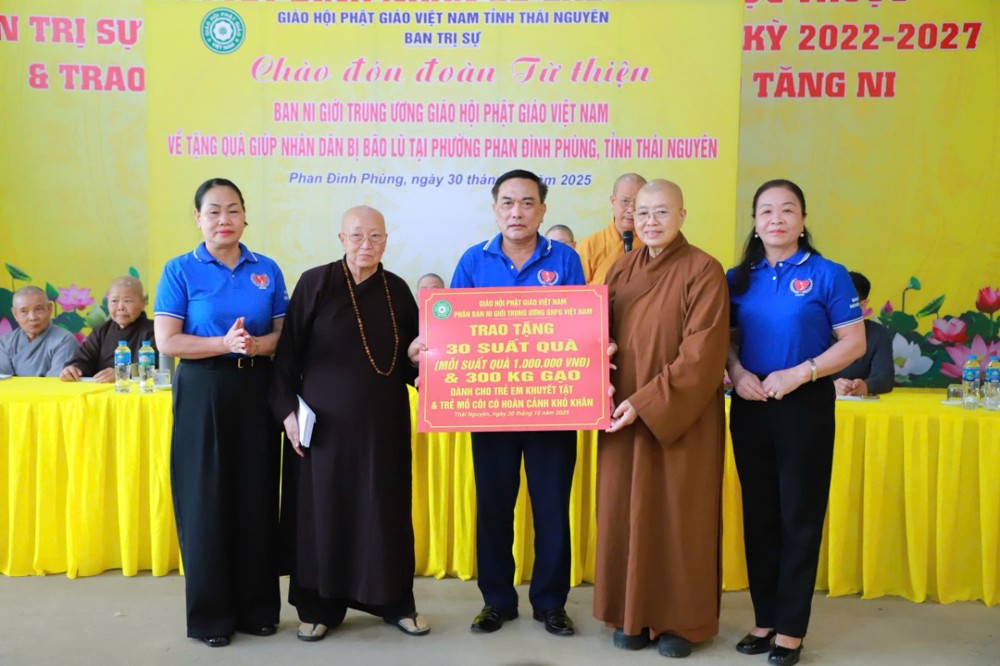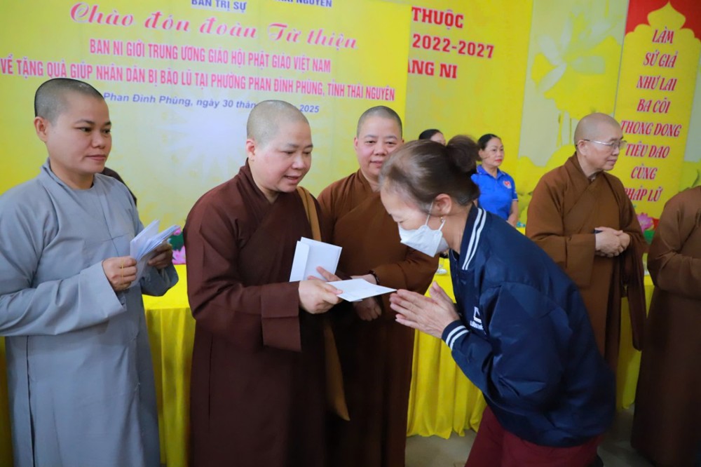PSO - Trong hành trình cứu trợ đồng bào chịu ảnh hưởng sau bão số 10 và 11, ngày 30 và 31/10/2025, Phân ban Ni giới Trung ương do Ni trưởng Thích Nữ Nhật Khương – Ủy viên Thường trực HĐTS, Trưởng Phân ban Ni giới TƯ, làm trưởng đoàn, đã đến tỉnh Thái Nguyên để trao tặng 1.000 phần quà, mỗi phần trị giá 1 triệu đồng tiền mặt, đến các hộ dân chịu thiệt hại nặng nề sau thiên tai.