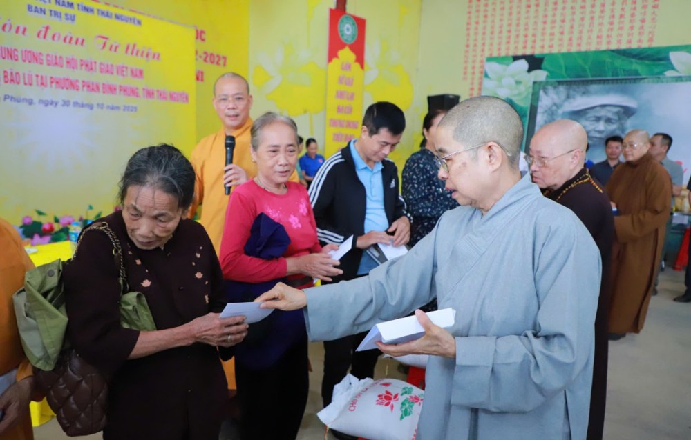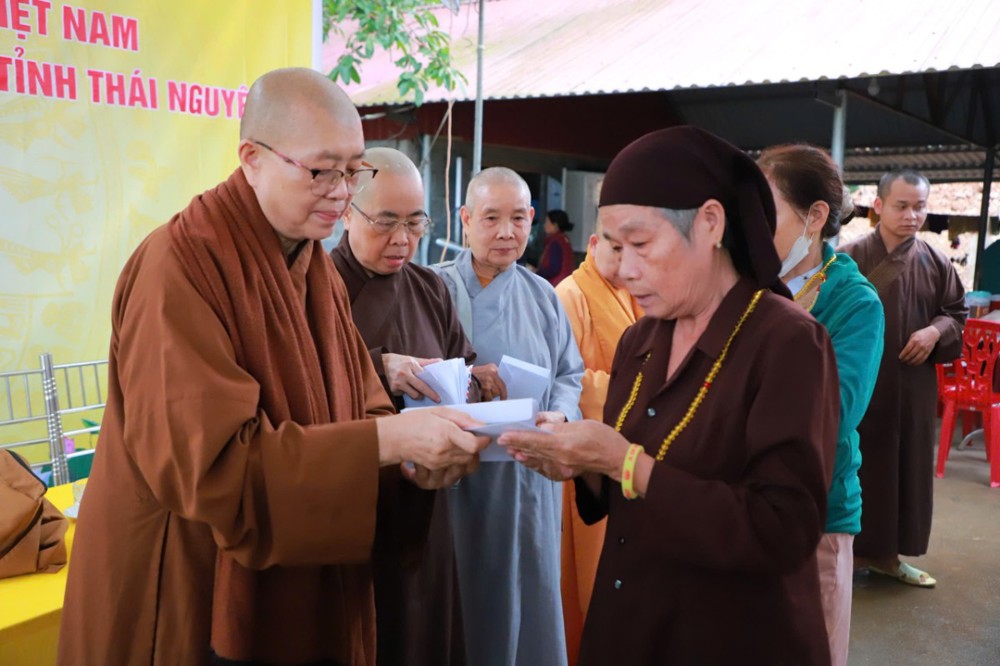 Tại tỉnh Thái Nguyên, đoàn đã trao quà tại 4 điểm: Chùa Phủ Liễn (Trụ sở BTS GHPGVN tỉnh Thái Nguyên), phường Phan Đình Phùng, TP.Thái Nguyên – 400 phần quà; chùa Cả, thị trấn Đình Cả, huyện Võ Nhai – 200 phần quà; chùa Nông Cúng, xã Tân Khánh, huyện Phú Bình – 200 phần quà; chùa Làng Ca, xã Kha Sơn – 200 phần quà.