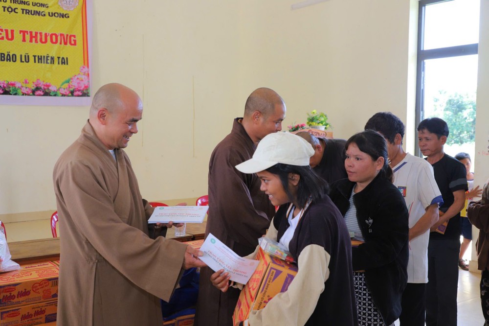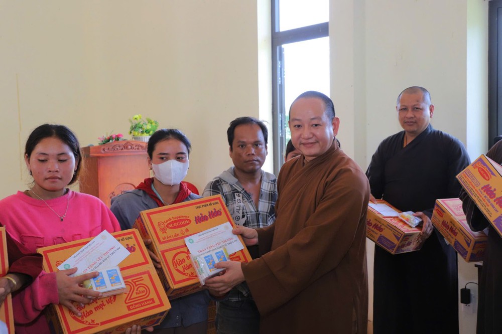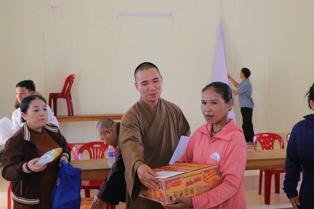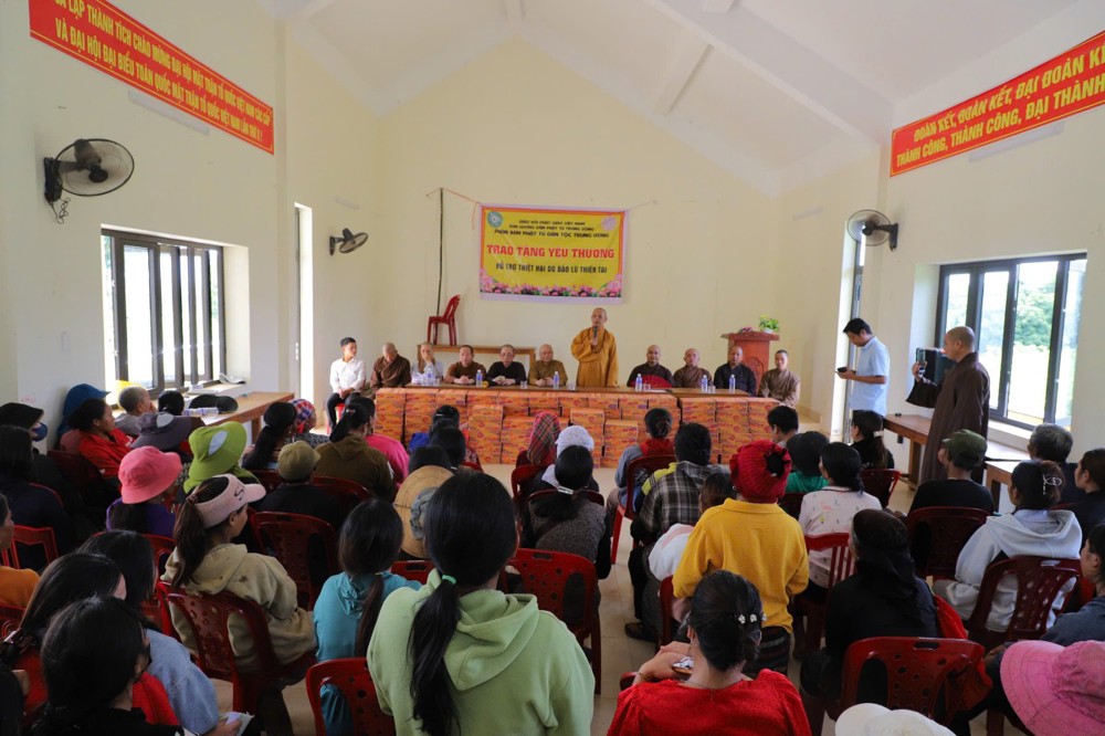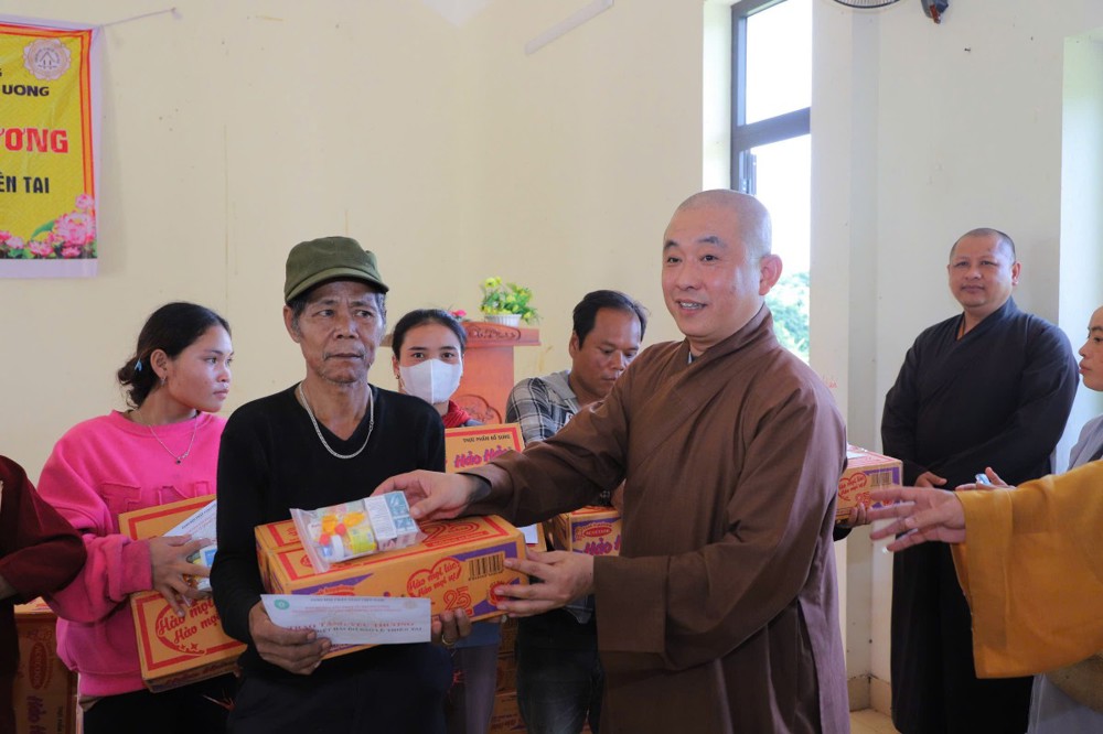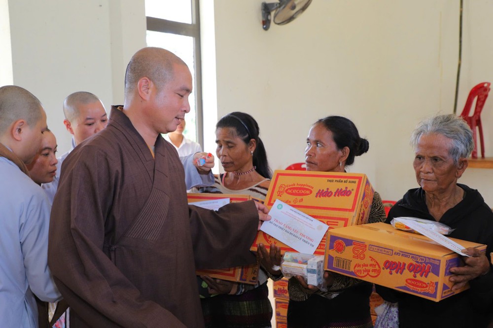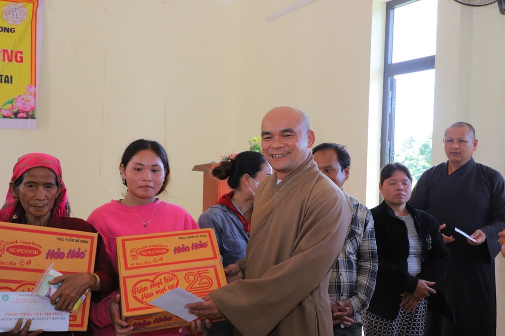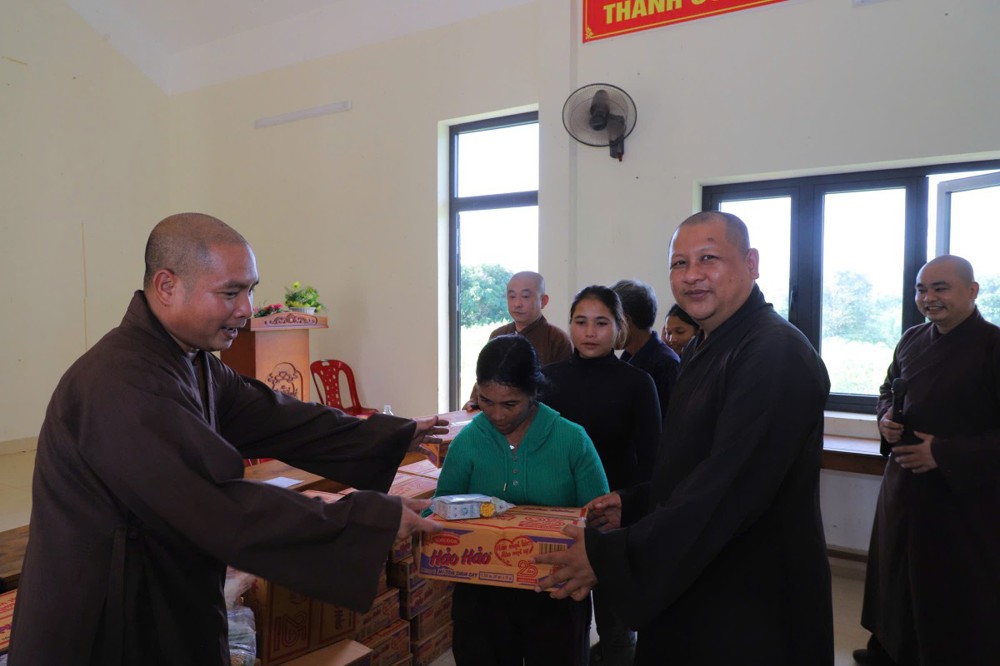 Tại buổi lễ, đoàn đã trao 100 suất quà, mỗi suất trị giá 700.000 đồng, bao gồm nhu yếu phẩm và tiền mặt, gửi đến các hộ dân bị thiệt hại bởi thiên tai. Những phần quà được tận tay chư Tăng Ni và Phật tử trao tặng trong không khí ấm áp tình người.