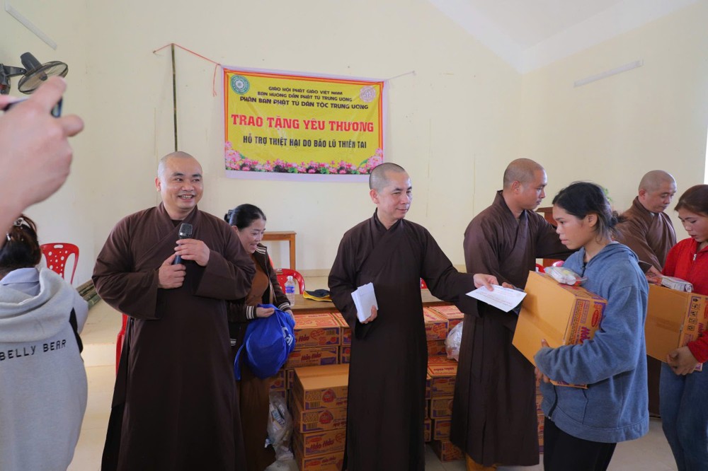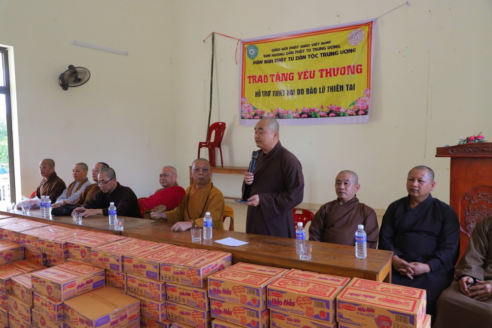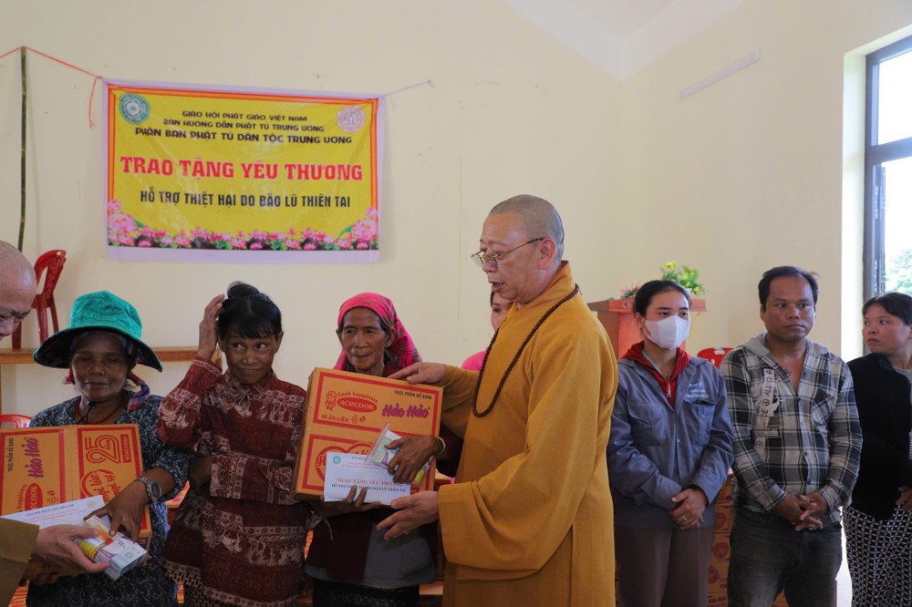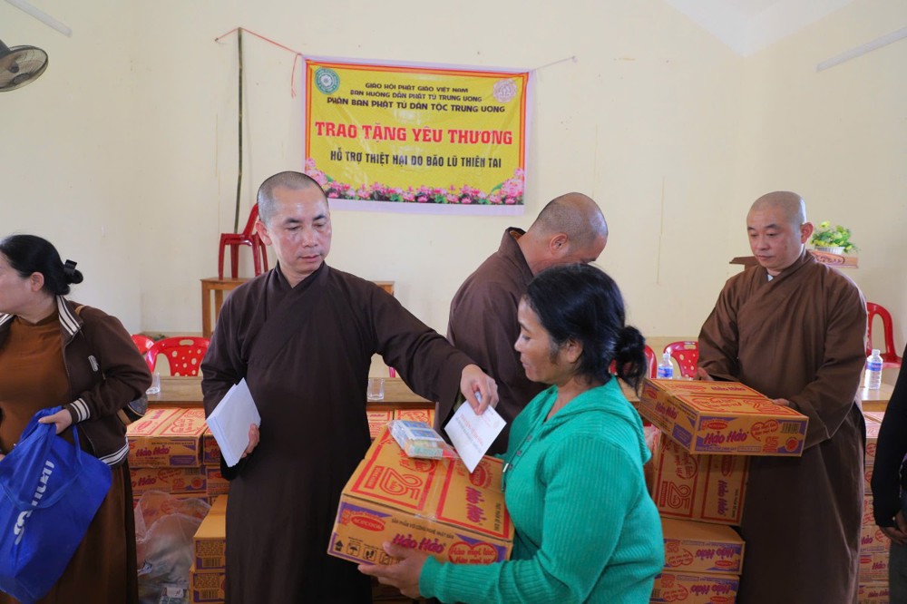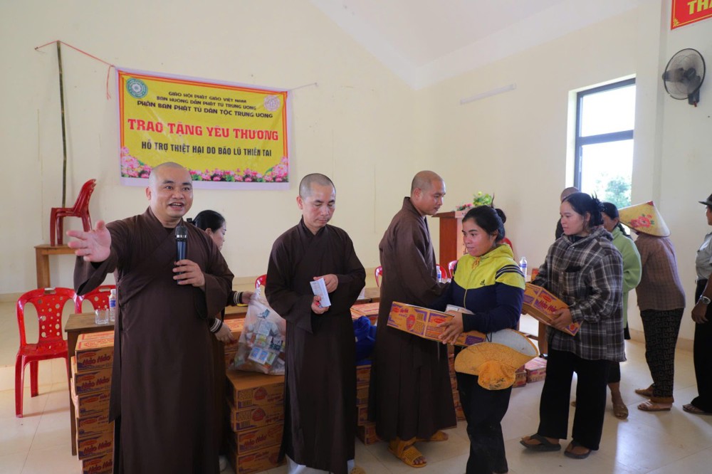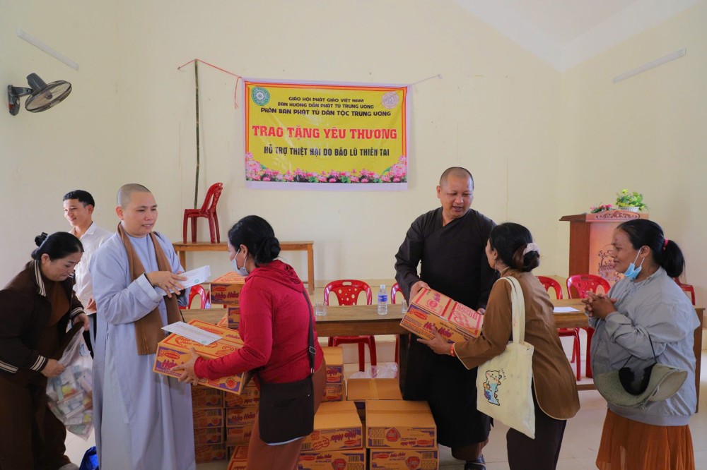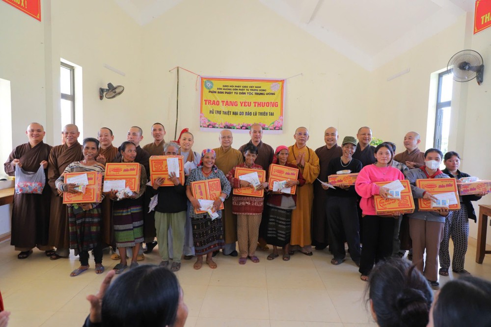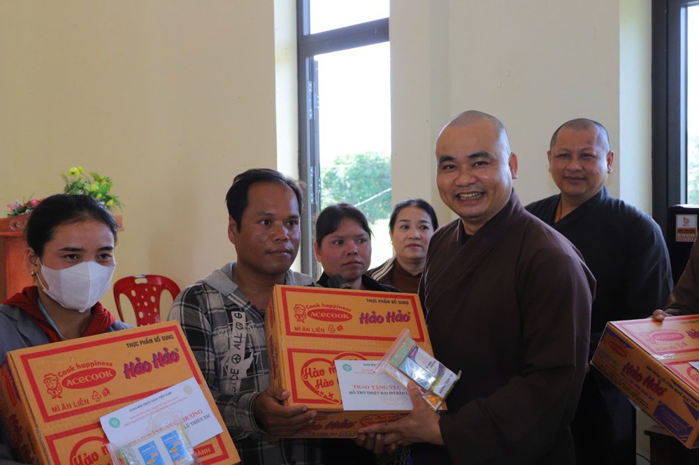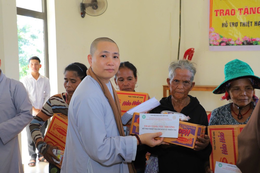 Tại buổi lễ, đoàn đã trao 100 suất quà, mỗi suất trị giá 700.000 đồng, bao gồm nhu yếu phẩm và tiền mặt, gửi đến các hộ dân bị thiệt hại bởi thiên tai. Những phần quà được tận tay chư Tăng Ni và Phật tử trao tặng trong không khí ấm áp tình người.