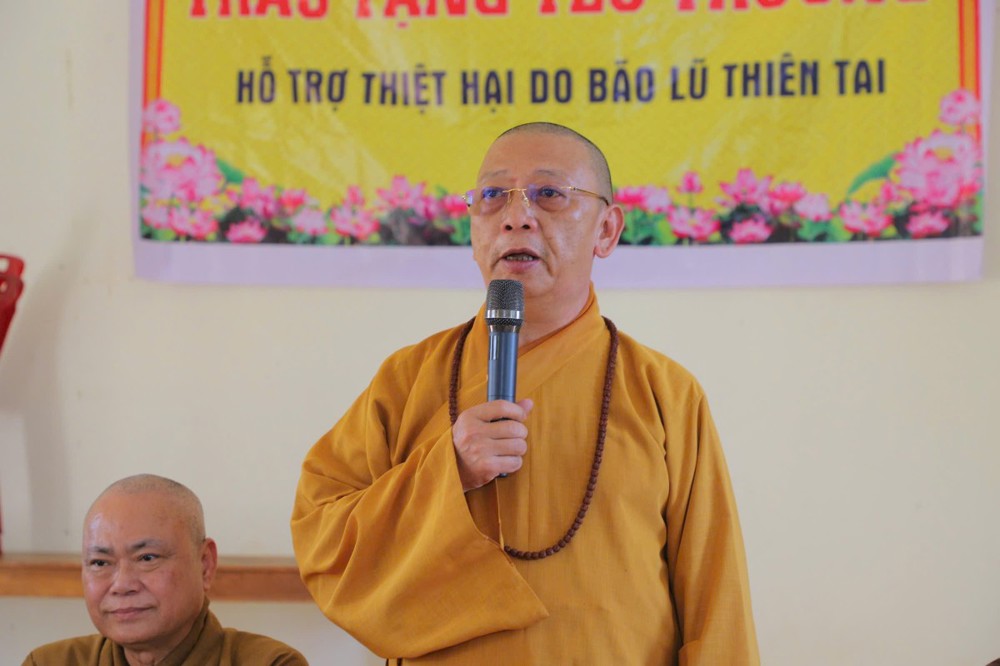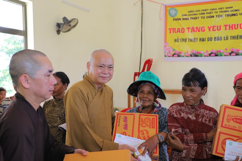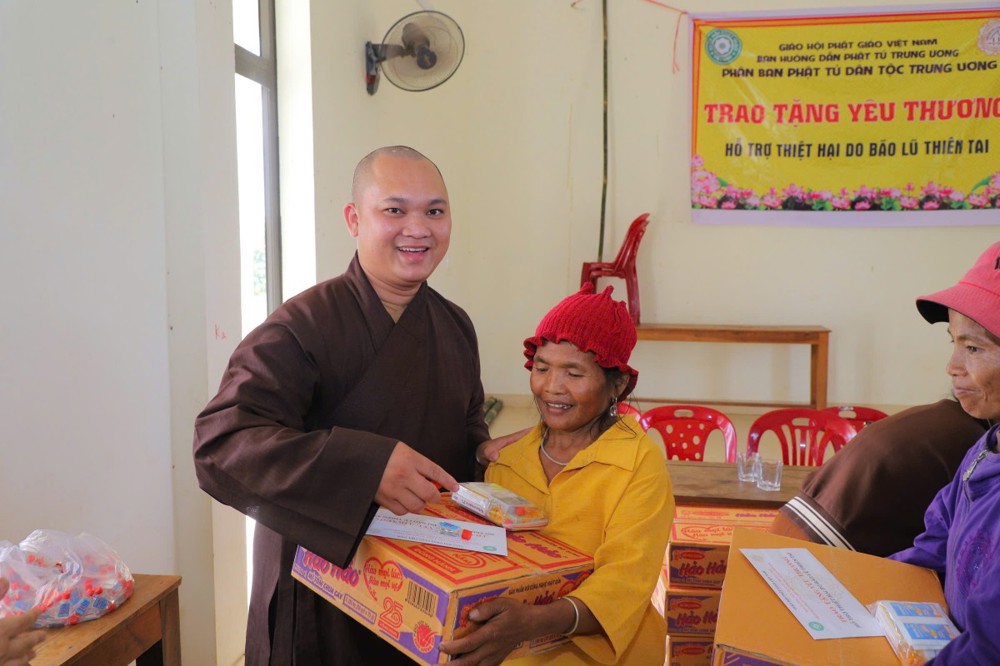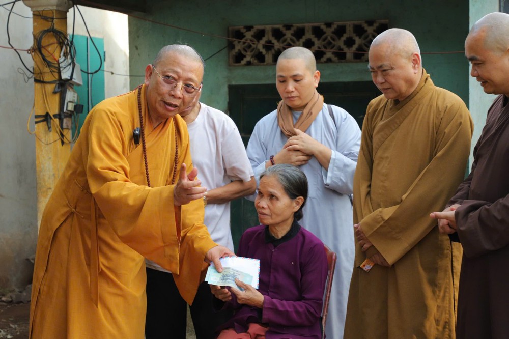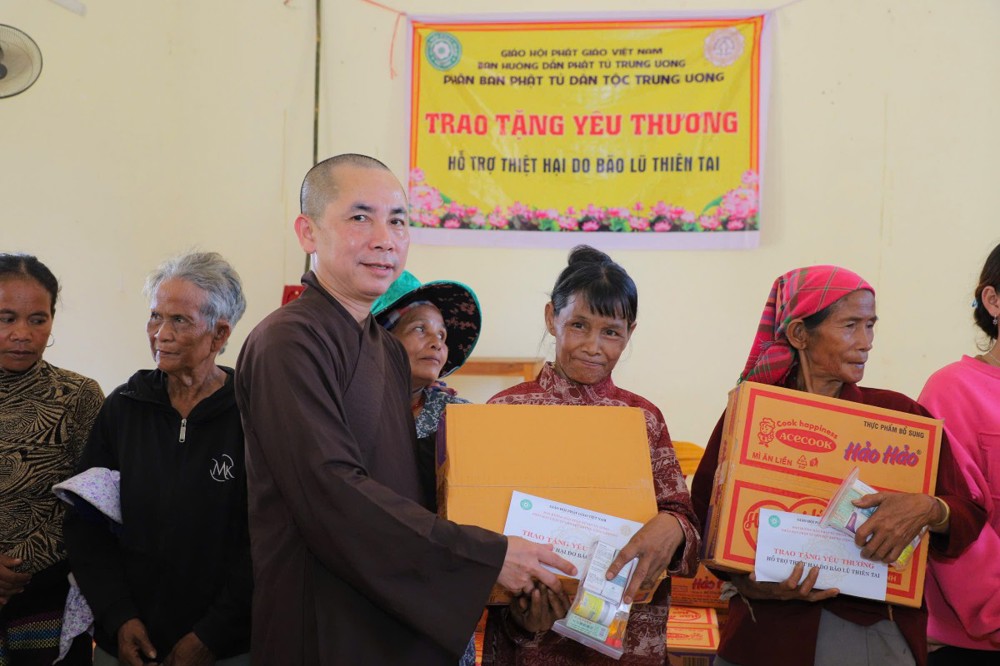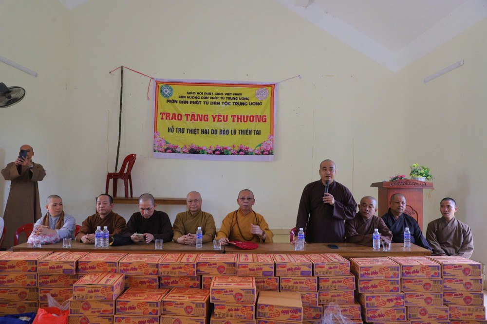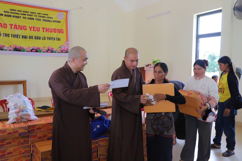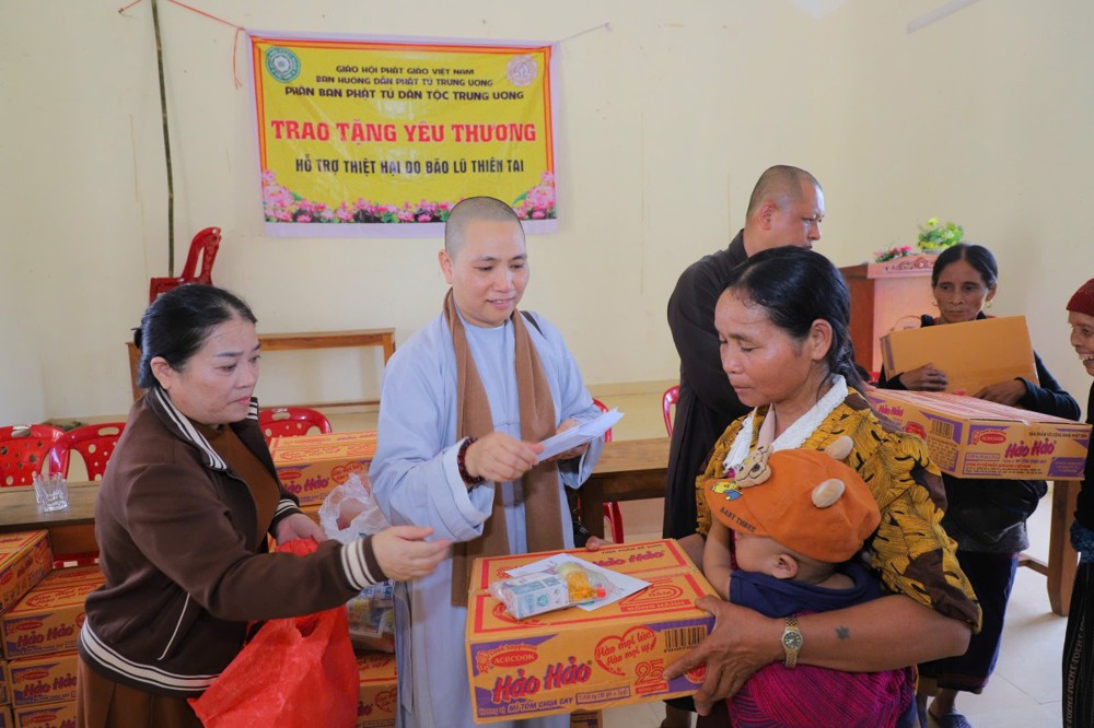 Tại buổi lễ, đoàn đã trao 100 suất quà, mỗi suất trị giá 700.000 đồng, bao gồm nhu yếu phẩm và tiền mặt, gửi đến các hộ dân bị thiệt hại bởi thiên tai. Những phần quà được tận tay chư Tăng Ni và Phật tử trao tặng trong không khí ấm áp tình người.