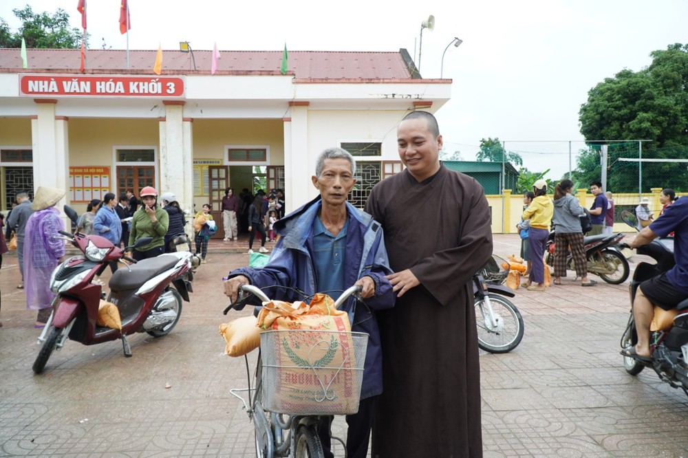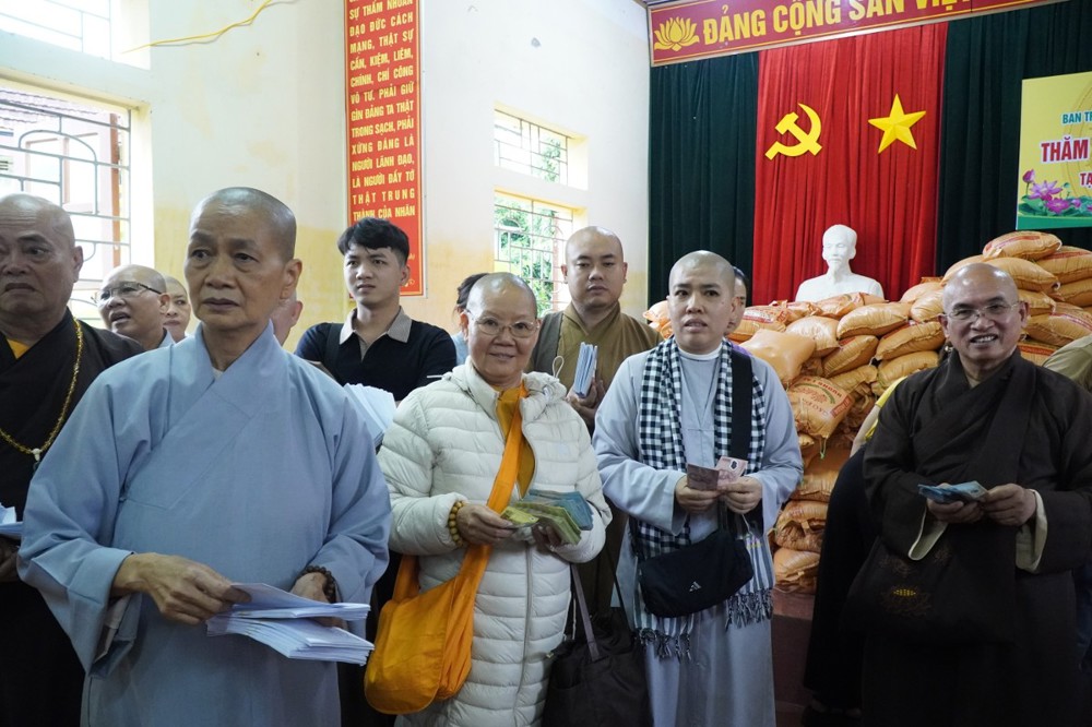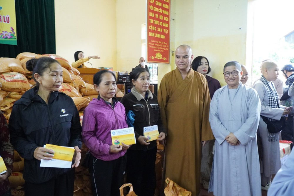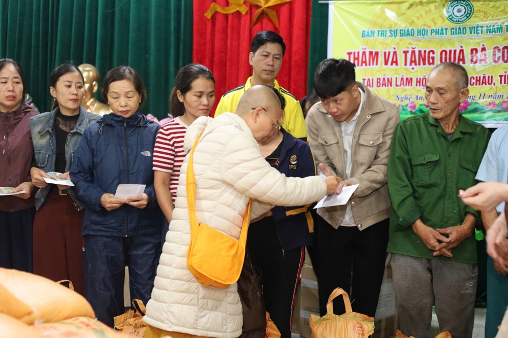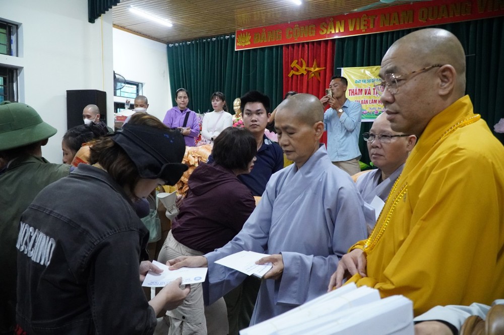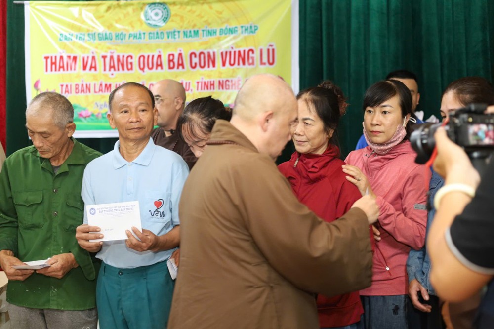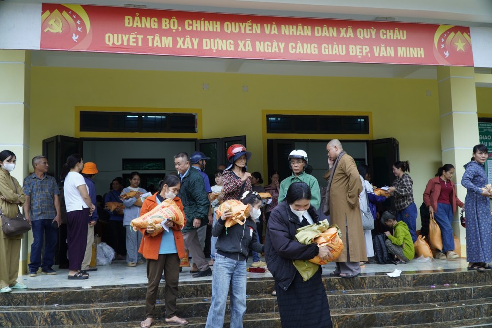 Ngày 1/11 đoàn khởi hành đến Bản Lâm Hội và Thôn 3 thuộc xã vùng cao Quỳ Châu, nơi chịu thiệt hại nặng nề sau bão. Tại 2 địa điểm, đoàn đã trao 1.000 phần quà gồm tiền mặt trị giá 1.000.000 đồng/phần, do Ban Trị sự GHPGVN tỉnh Đồng Tháp ủng hộ, cùng gạo, mì, nhu yếu phẩm do chư Tăng Ni và Phật tử các tự viện chung tay đóng góp. Tổng trị giá hơn 01 tỷ đồng.