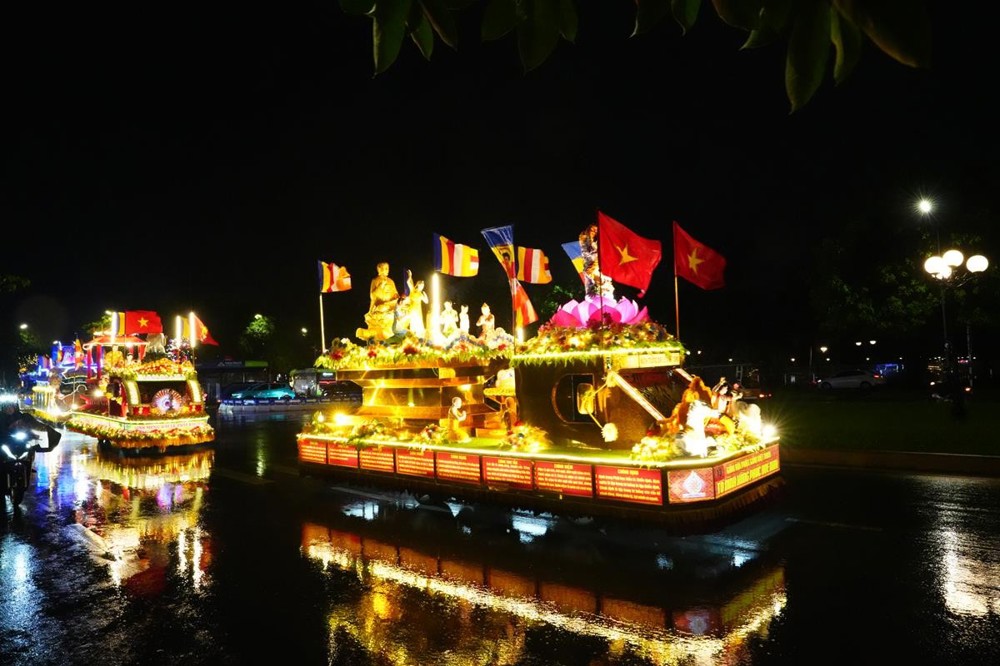 Đúng 19h05, cơn gió nhẹ thoảng qua mang theo lá vàng bay và những hạt mưa lất phất đầu mùa, gần 40 chiếc xe hoa rực rỡ sắc màu bắt đầu lăn bánh, tạo nên sự thiêng liêng và xúc động trong lòng những ai có duyên chứng kiến. Dẫn đầu đoàn là xe của Ban Trị sự GHPGVN TP. Hà Nội, tiếp nối là những chiếc xe hoa của Ban Trị sự Phật giáo các quận, huyện, đạo tràng, xe chiêng – trống, xe chư tôn đức và đông đảo Phật tử cùng nhân dân cùng đồng hành trên các tuyến đường.