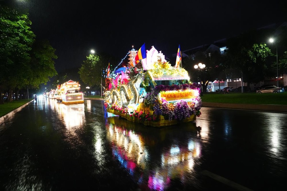 Cơn mưa dần nặng hạt, nhưng tiếng nhạc kính mừng Phật Đản vẫn vang vọng khắp không gian, hòa quyện với ánh sáng lung linh từ đoàn xe hoa, làm lay động lòng người. Cờ ngũ sắc tung bay phấp phới trong gió mưa, từng đoàn xe lướt đi trong sự trào dâng cảm xúc và lòng biết ơn vô hạn của tất cả những người con Phật hướng về bậc Đại Giác.