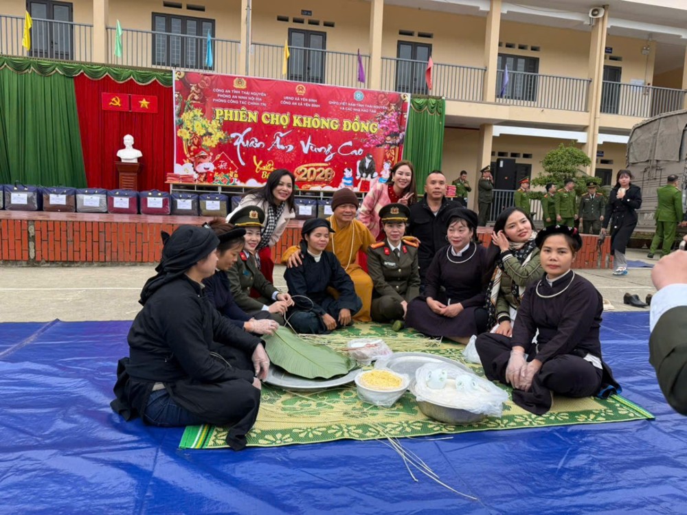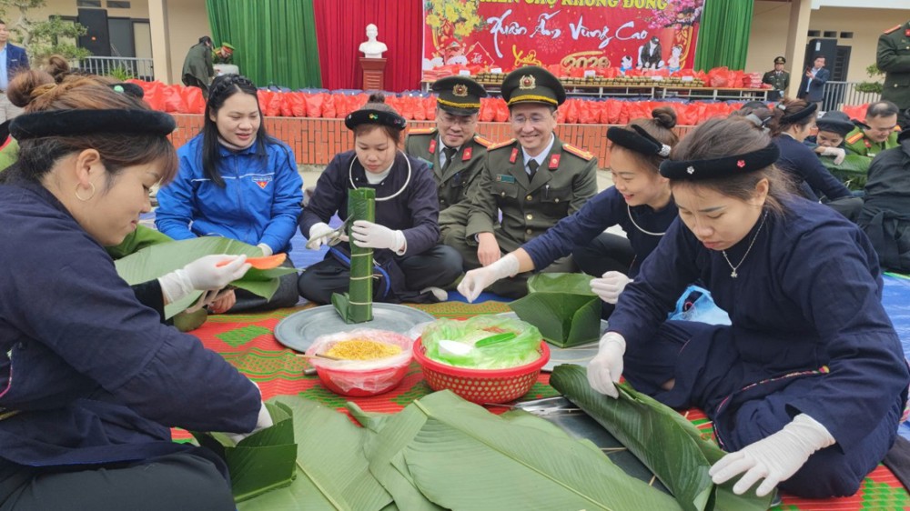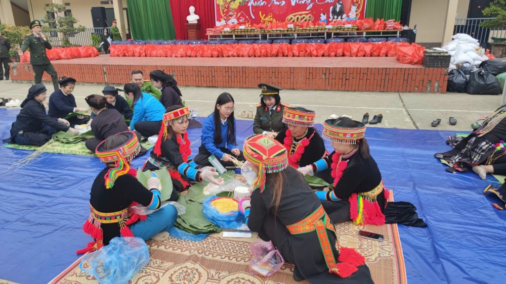 Ngay từ sáng sớm, khu vực trao quà đã rộn ràng không khí sum vầy, ấm áp nghĩa tình. Những phần quà Tết được Ban Tổ chức trao tận tay bà con trong sự ân cần thăm hỏi, động viên, tạo nên hình ảnh xúc động trong những ngày cuối năm. Dịp này, Ban Tổ chức còn chuẩn bị đầy đủ vật phẩm thiết yếu và tổ chức Hội thi gói bánh chưng, mang đến không khí vui tươi, ấm áp giữa giá lạnh mùa đông vùng cao, như một ngày hội Đại đoàn kết toàn dân.