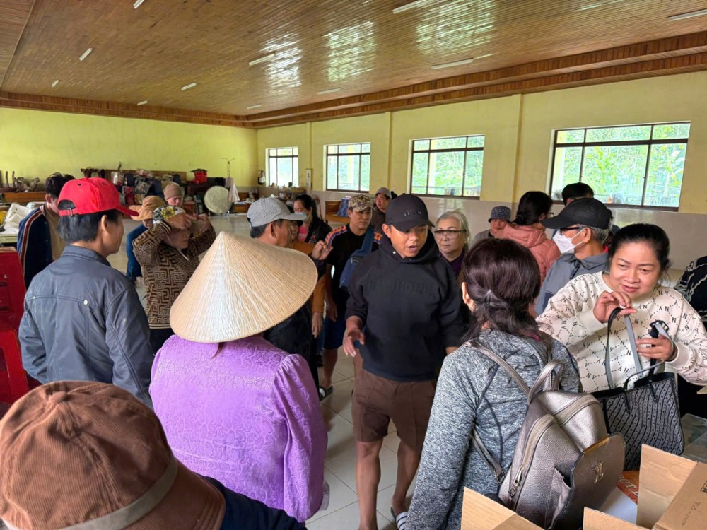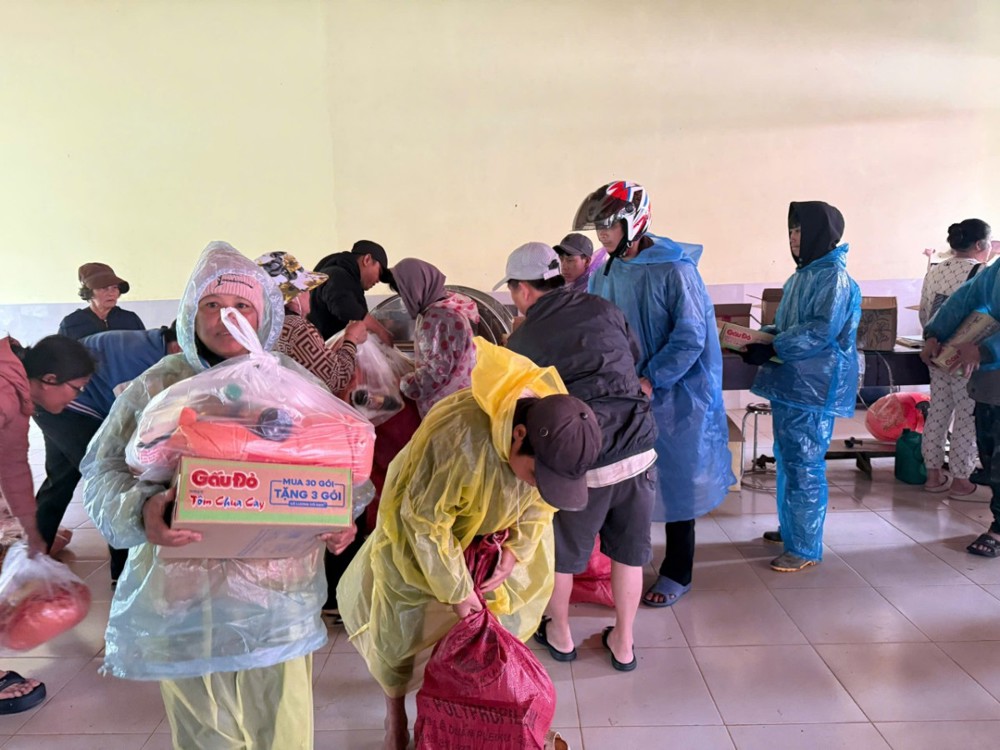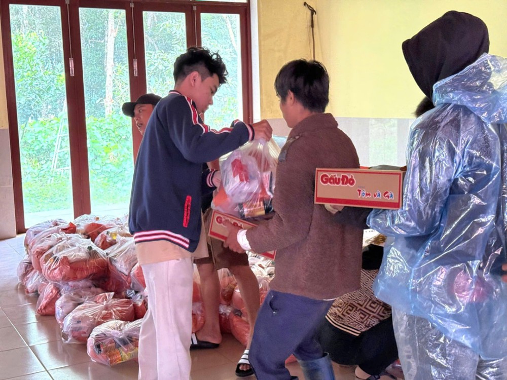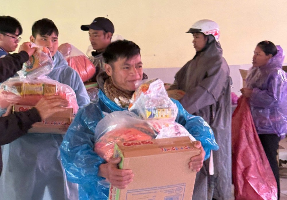 Tại khuôn viên chùa Khánh Lâm, phái đoàn từ thiện đã trao tặng 100 phần quà cứu trợ cho bà con khó khăn. Mỗi phần quà trị giá khoảng 500.000 đồng, được đóng gói chu đáo với những nhu yếu phẩm thiết yếu như gạo, mì tôm, dầu ăn, đường, bánh, quần áo cùng bao thư 200.000 đồng nhằm giúp các hộ dân ổn định cuộc sống sau lũ.