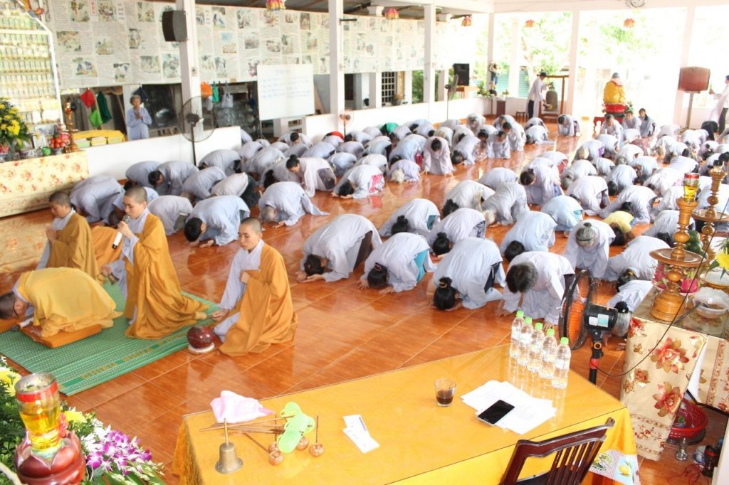 Toàn thể chúng hội cùng niêm hương bạch Phật, đảnh lễ Tám tướng thành đạo của đức Bổn Sư: " A Tỳ ngục tốt sơ phát lòng lành, nhiều kiếp tu hành, công viên quả mãn. Bổn Sư Thích Ca Mâu Ni Phật"...