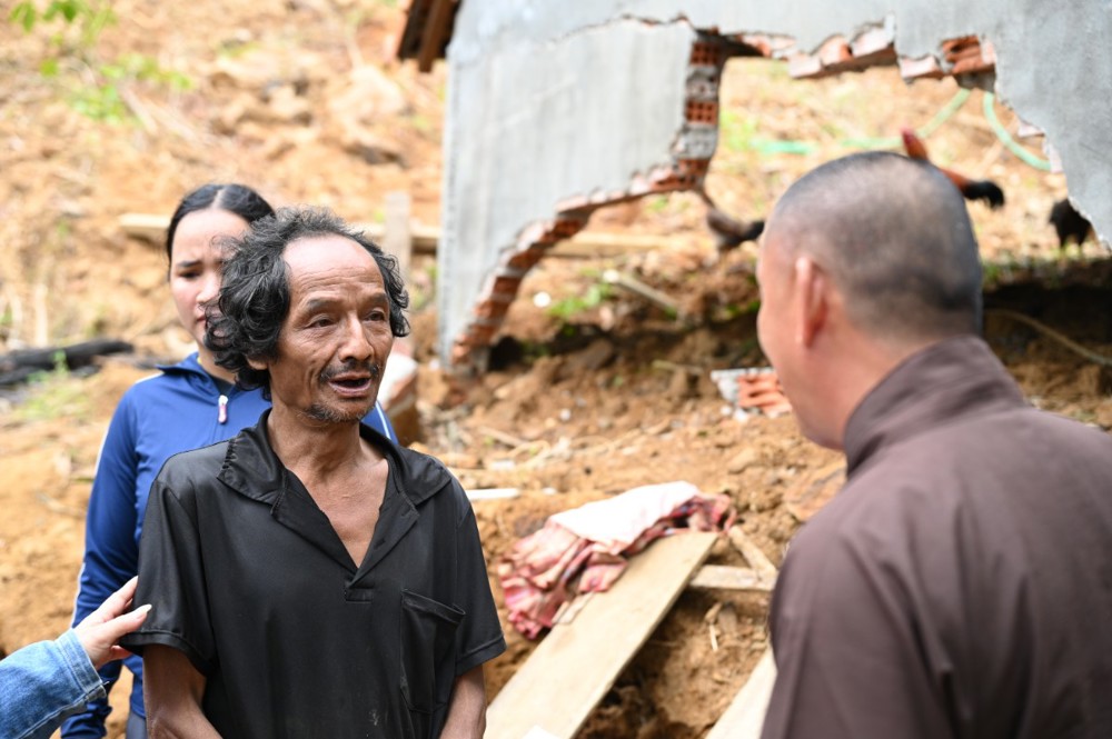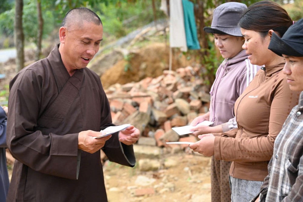 Thay mặt đoàn, chư Tôn đức đã trao hỗ trợ 5 triệu đồng giúp anh Khóa sớm dựng lại mái ấm. Tiếp đoàn tại đây có bà Hồ Thị Nhiên – Thôn trưởng – người luôn tích cực hỗ trợ bà con trong thiên tai.