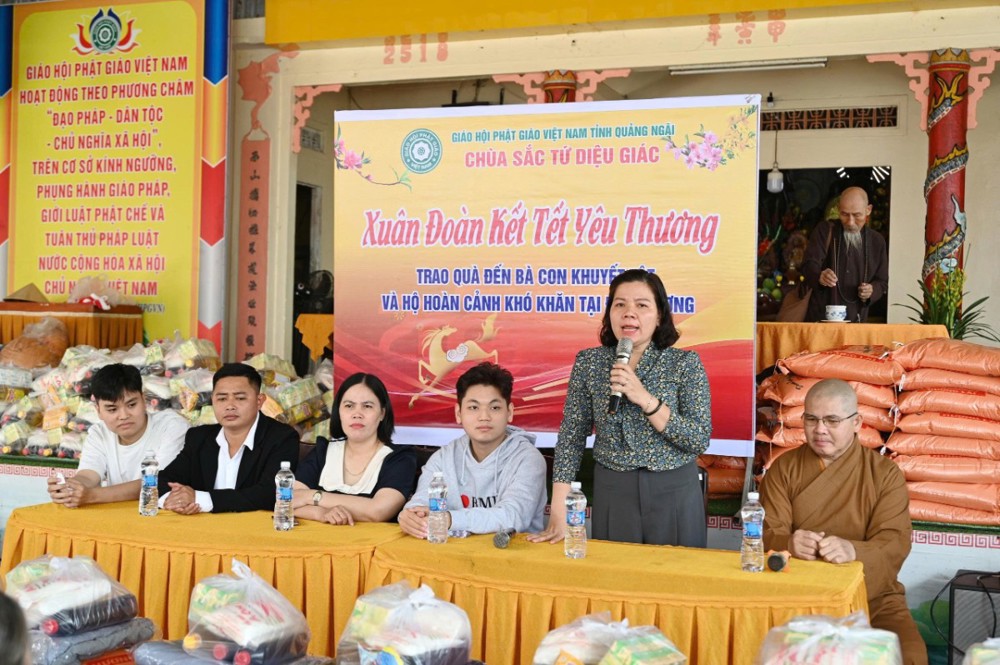 Đại diện chính quyền địa phương tham dự chương trình, bà Lê Thị Thanh Hồng – Chủ tịch Ủy ban MTTQVN xã Bình Sơn – bày tỏ sự trân trọng trước những đóng góp thiết thực của nhà chùa. Thay mặt lãnh đạo địa phương, bà gửi lời cảm ơn đến chư Tôn đức Tổ đình Sắc Tứ Diệu Giác cùng quý mạnh thường quân, nhà hảo tâm đã luôn đồng hành trong công tác an sinh xã hội, góp phần lan tỏa tinh thần “tốt đời, đẹp đạo” của Phật giáo Việt Nam.
