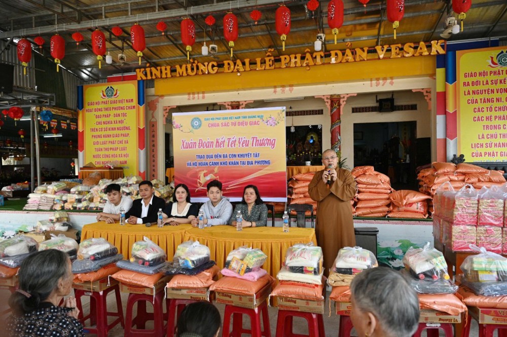 Tại buổi trao quà, thay mặt chư Tăng Tổ đình Sắc Tứ Diệu Giác, Thượng tọa Thích Nguyên Toàn đã có lời thăm hỏi, động viên bà con nỗ lực vượt qua khó khăn, vươn lên trong cuộc sống. Nhân dịp Xuân Bính Ngọ 2026, Thượng tọa cũng gửi lời chúc năm mới vô lượng an lạc, kiết tường như ý đến toàn thể đại chúng.