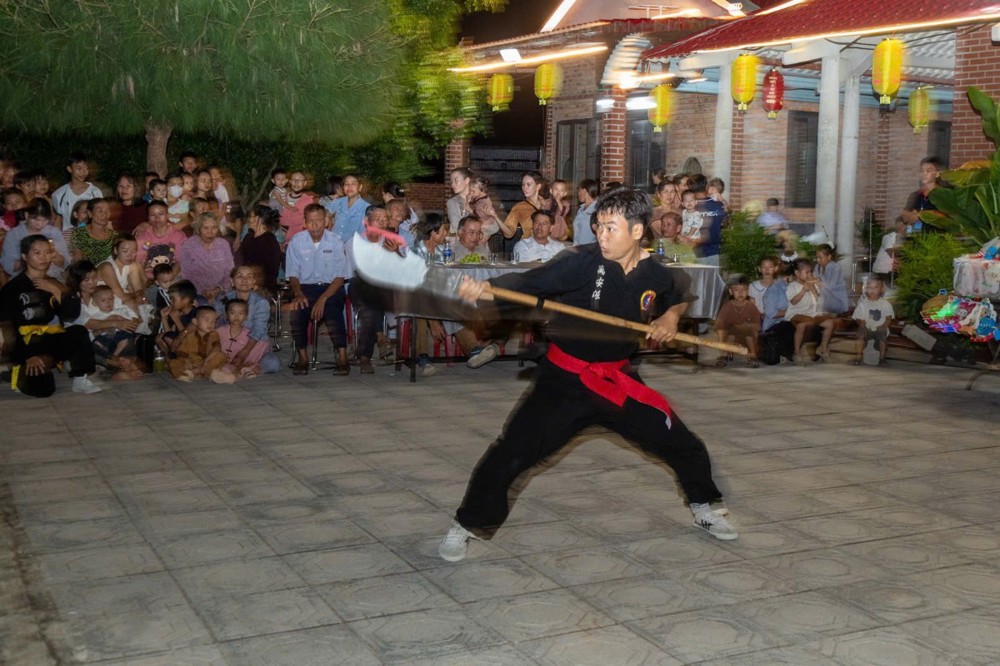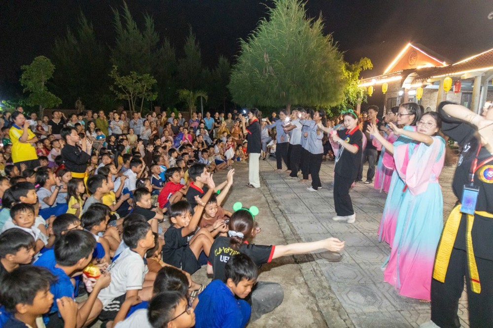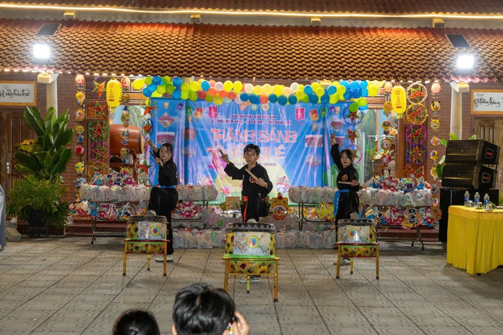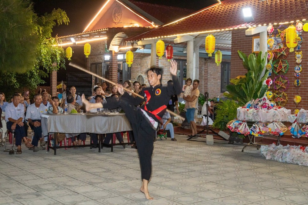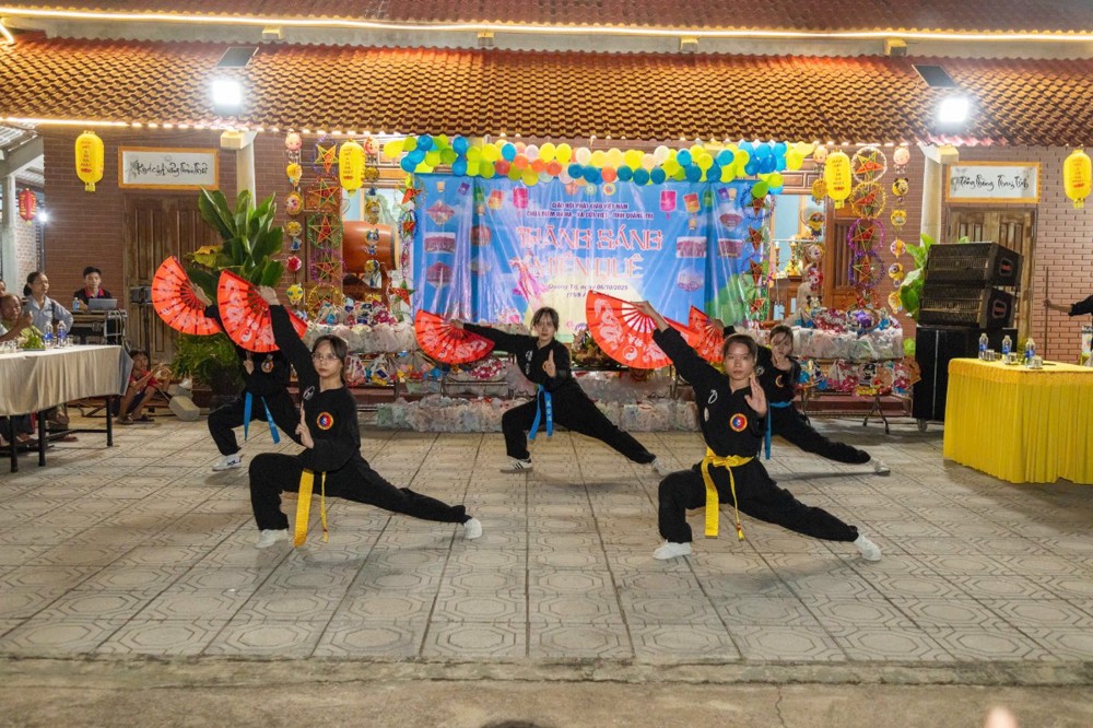 Một điểm nhấn đặc sắc của đêm hội là phần trình diễn “Tinh hoa Võ Việt” từ Câu lạc bộ Võ Kinh Vạn An. Các tiết mục võ thuật, vốn xuất phát từ cung đình triều Nguyễn, không chỉ thu hút sự thích thú của các em bởi vẻ đẹp uyển chuyển, mạnh mẽ mà còn góp phần kết nối di sản văn hóa dân tộc với tinh thần phụng sự. Màn trình diễn mang đến không khí hào hùng, sôi động, đồng thời lồng ghép những bài học về kỷ luật, sự kiên trì – những phẩm chất quan trọng trong cả tu tập lẫn cuộc sống. Xen kẽ là các hoạt động múa lân, văn nghệ, giao lưu và trò chơi tập thể, tạo nên không khí vui tươi, gắn kết, giúp các em thiếu nhi tận hưởng một đêm Trung thu trọn vẹn.