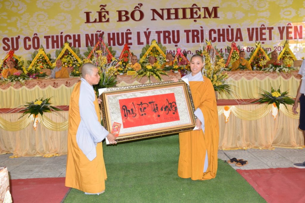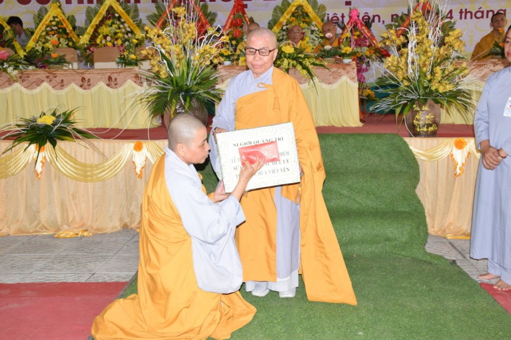 Sư cô tân Trụ trì thành kính đảnh lễ và bày tỏ niềm tri ân sâu sắc đối với chư Tôn đức lãnh đạo Giáo hội tỉnh, BTS PG huyện Triệu Phong đã tin tưởng tín nhiệm và giao phó giữ trọng trách trụ trì chùa Việt Yên; Đồng thời phát nguyện dấn thân để làm tròn trọng trách mà BTS tỉnh và huyện giao phó, nguyện sống hòa hợp, đoàn kết và làm tròn nhiệm vụ “Tác Như Lai sứ, hành Như Lai sự”, hoằng pháp độ sanh, thực hiện đúng theo Hiến chương của GHPGVN và Pháp luật của Nhà nước CHXHCN Việt Nam. Qua đây, Sư cô tân Trụ trì xin thành kính đảnh lễ bái tạ thâm ân và nguyện cầu hồng ân Tam Bảo gia hộ cho chư Tôn thiền đức, tứ đại điều hòa cửu trụ Ta bà để hướng dẫn chúng sanh quay về chánh pháp, thành kính tri ân đến quý vị đại biểu các cấp Chính quyền, thiện nam tín nữ Phật tử gần xa, chúc quý vị sức khỏe, thành đạt và an lành.