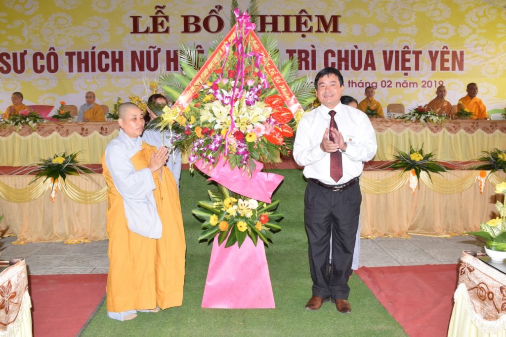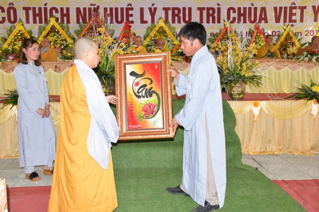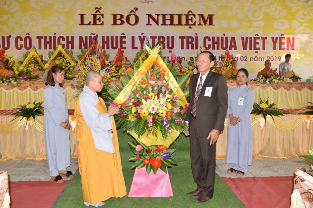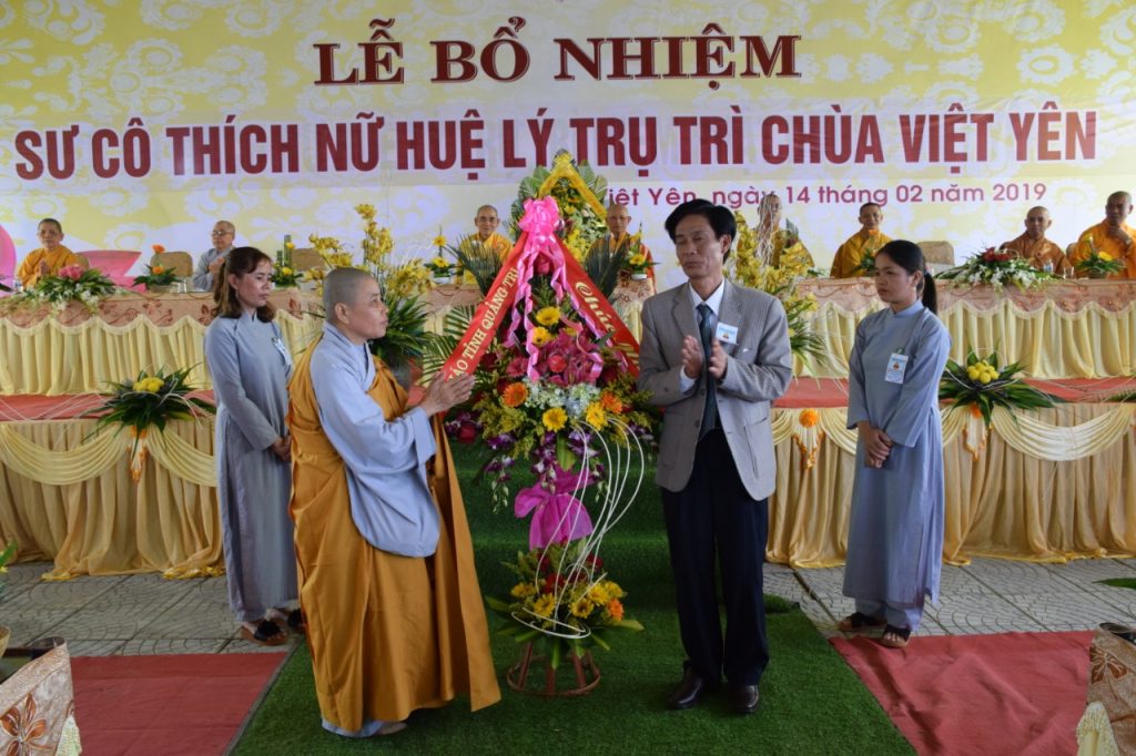 Thay mặt Thường trực BTS GHPGVN tỉnh, HT. Thích Thiện Tấn ban đạo từ đã sách tấn Sư cô tân Trụ trì hãy cố gắng nỗ lực, hoàn thành tốt trọng trách mà Giáo hội giao phó, tạo niềm tin Phật pháp, để mọi người có cái nhìn tốt đẹp về đạo Phật để đưa Chánh pháp của Như Lai đi vào đời sống. Qua đây, Hòa thượng cũng gửi lời chào năm mới đến với tất cả bà con Phật tử, gửi lời cảm ơn đến các cấp chính quyền đã tạo mọi điều kiện cho Phật giáo huyện nhà nói chung và chùa Việt Yên nói riêng phát triển trong thời gian qua.
