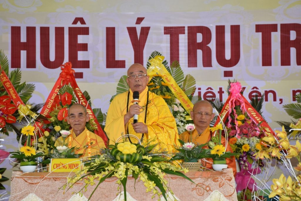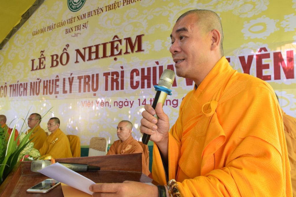 Thay mặt ban Tổ chức, Đại đức Trưởng BTS PG huyện Triệu Phong, Trưởng ban Tổ chức đã phát biểu khai mạc cảm niệm ân đức của chư Tôn đức và cảm ơn đến lãnh đạo chính quyền các cấp, mặc dầu đầu năm mới công việc bộn bề nhưng đã quan tâm tham dự buổi lễ. Đại đức nêu lên những khó khăn và thuận lợi trong công tác Phật sự trên địa bàn huyện nhà, trong đó sơ lược về ngôi chùa Việt Yên cũng như những nỗ lực hoạt động hoằng dương Phật pháp của Sư cô tân trụ trì trong thời gian qua.