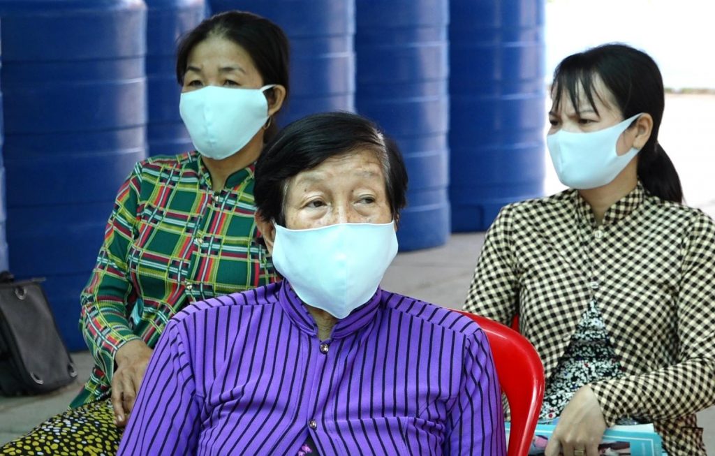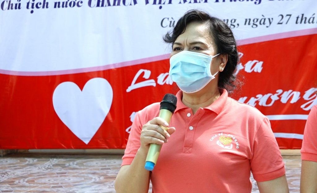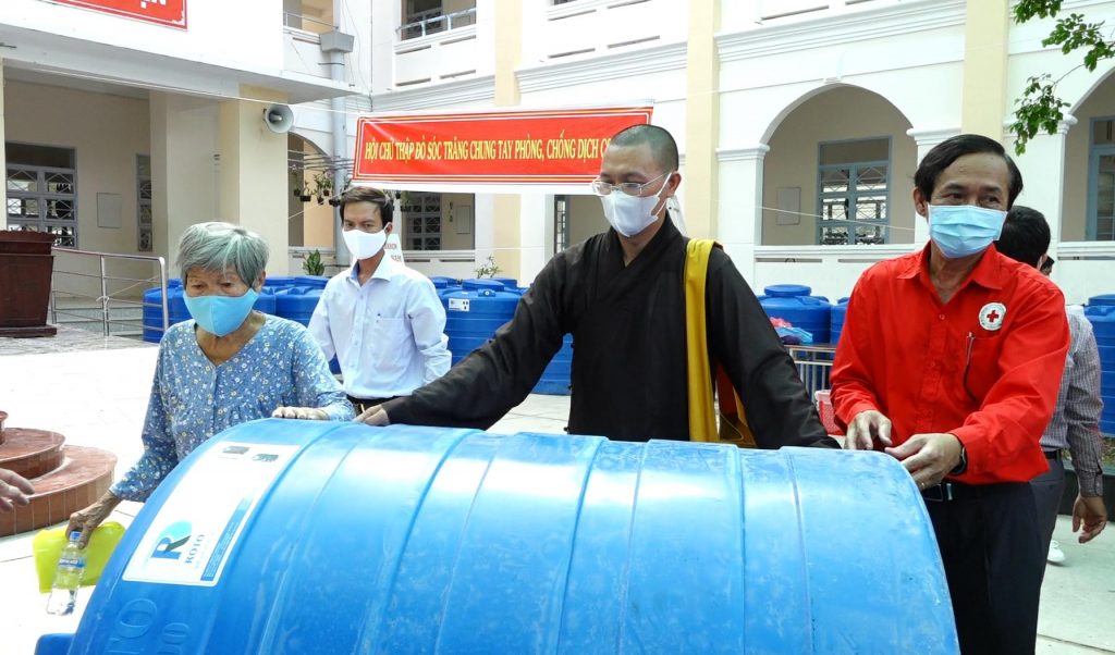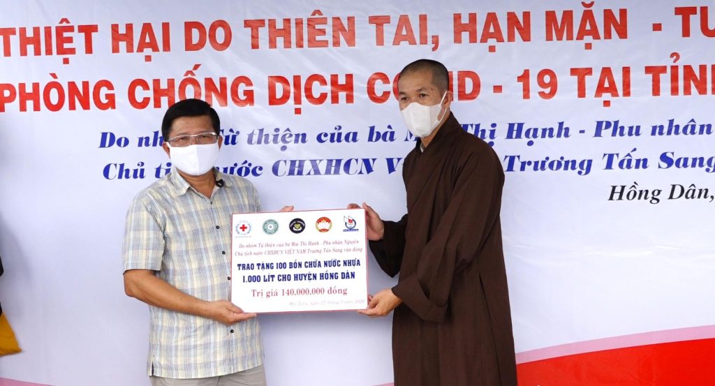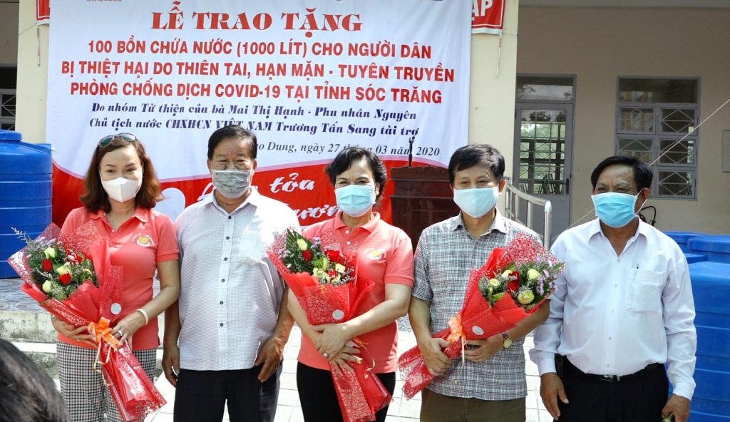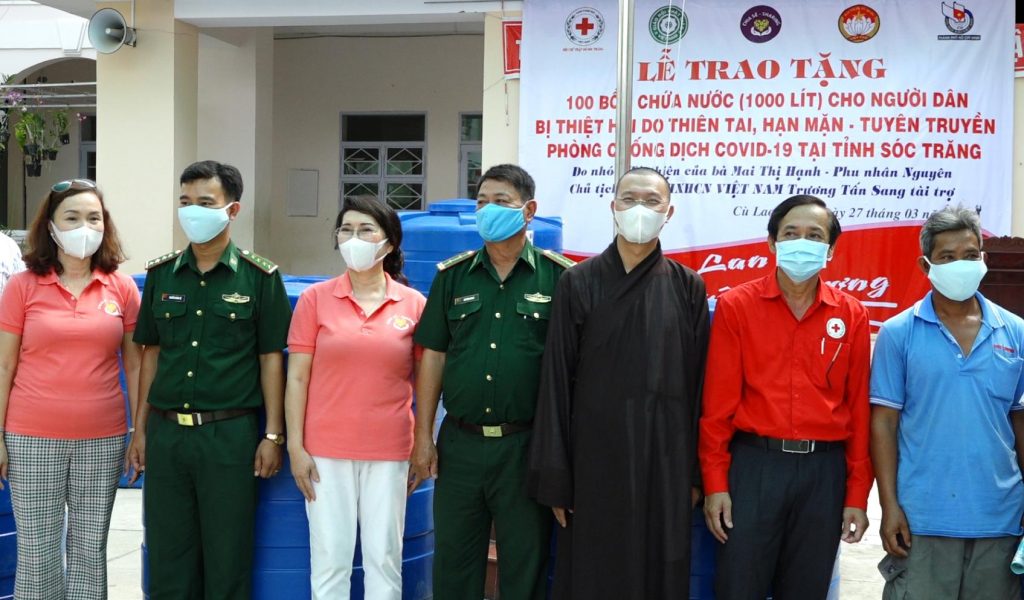 PSO - Ngày thứ hai của chuyến từ thiện, sáng ngày 27/03/2020, nhóm từ thiện của bà Mai Thị Hạnh - Phu nhân nguyên Chủ tịch nước Trương Tấn Sang kết hợp với TT. Thích Thanh Phong - Trưởng Ban Từ thiện xã hội GHPGVN TP. HCM; Trung ương Hội chữ thập đỏ Việt Nam; Mặt trận tổ quốc Việt Nam TP. HCM; Hội nhà báo TP. HCM, đã trao tặng 104 bồn nước cho bà con ở thị trấn Cù Lao Dung, huyện Cù Lao Dung, tỉnh Sóc Trăng bị ảnh hưởng của hạn hán, xâm nhập mặn và tặng khẩu trang góp phần tuyên truyền phòng, chống dịch Covid-19.