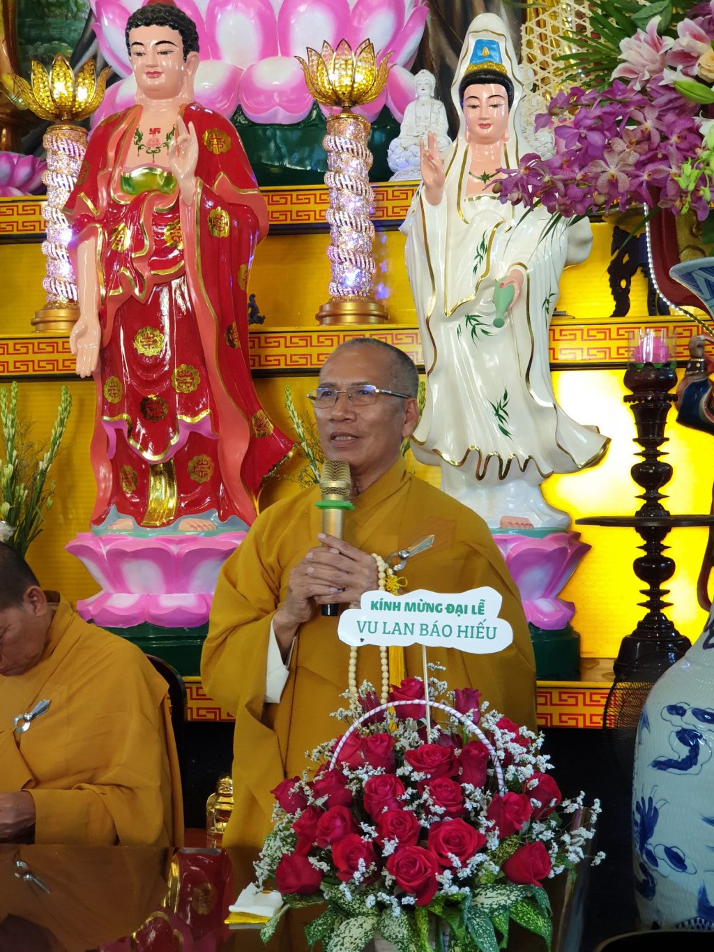 TT.Thích Minh Hạnh - Ủy viên HĐTS, Phó trưởng Ban Thường trực Phật giáo tỉnh ban đạo từ; tán thán công đức Đại đức Trụ trì và quý Phật tử chùa Khánh Sơn. Chúng ta là đệ tử Phật, phải biết báo đáp Tứ trọng ân (ân cha mẹ, ân Tam bảo, ân tổ quốc và ân chúng sanh vạn loại). Người Phật tử phải là người thể hiện trọn vẹn tấm lòng hiếu thảo với cha mẹ, từ đó xây dựng nền tảng đạo đức cho gia đình và xã hội. Đây cũng chính là mục tiêu mà Phật giáo đi vào đời để phục vụ chúng sanh, cũng là ý nghĩa thiết thực của Vu lan Báo hiếu. Thành tâm cầu nguyện chư Phật gia hộ chư Tôn đức và quý Phật tử thân tâm an lạc, sở nguyện sở cầu đều như ý. Cầu nguyện chư hương linh nương nhờ Phật lực siêu sanh về thế giới an lành.
