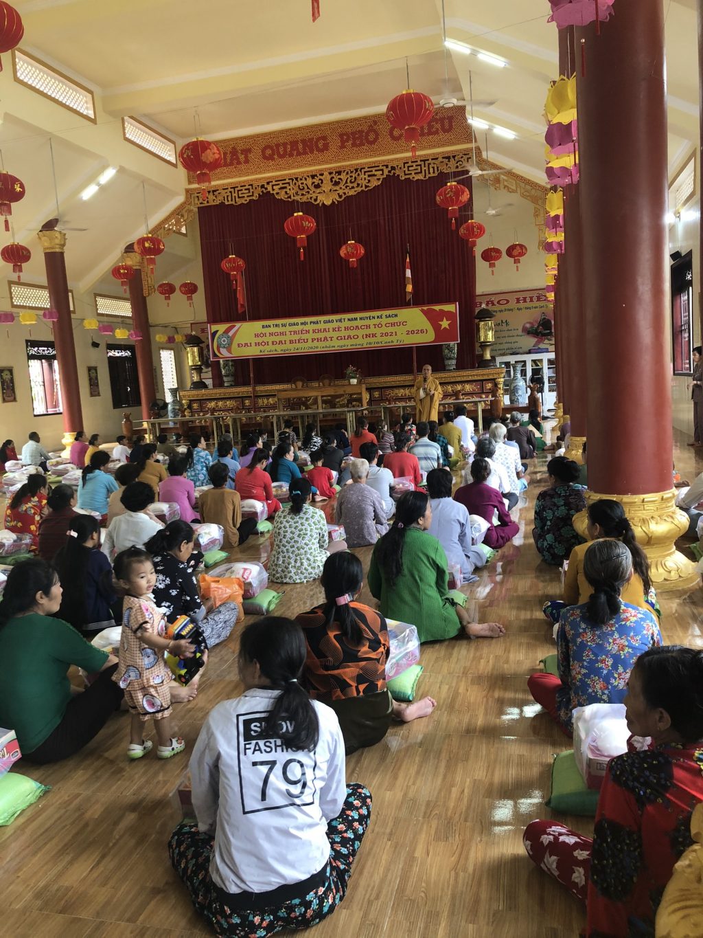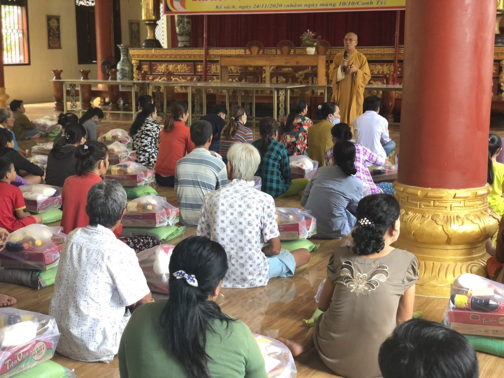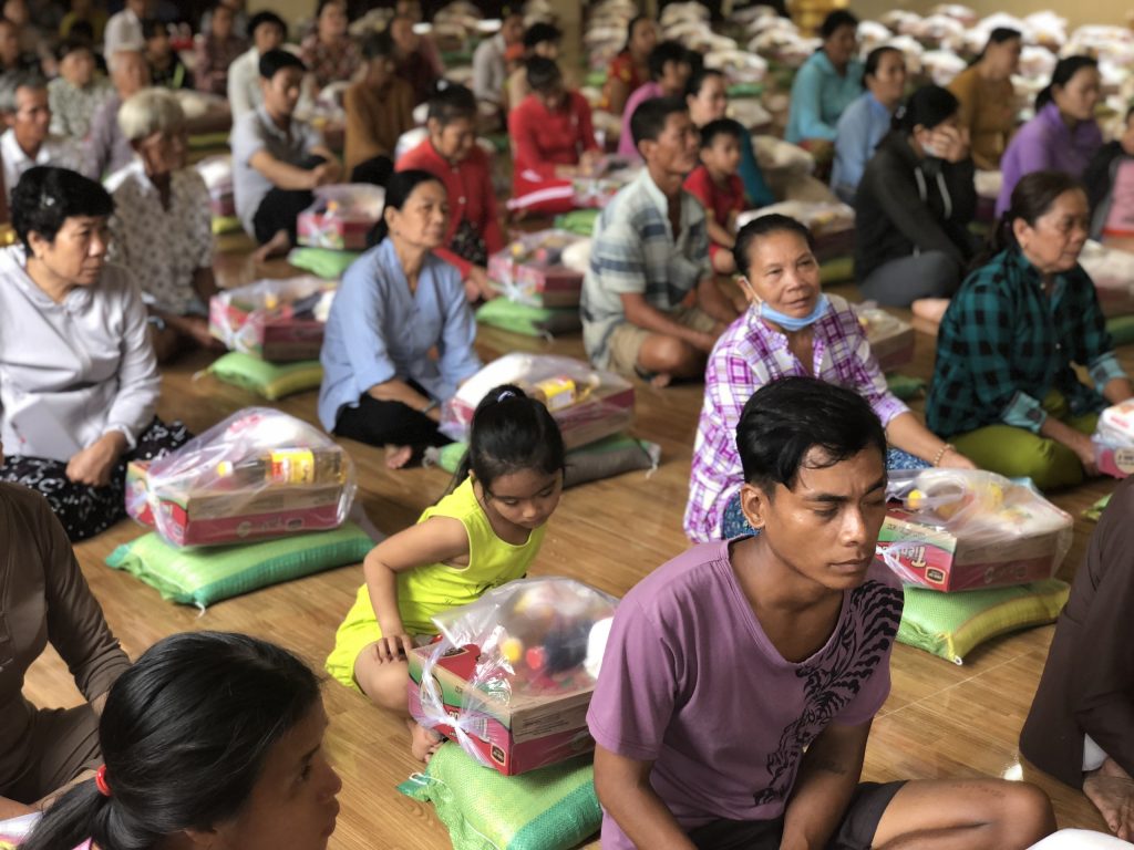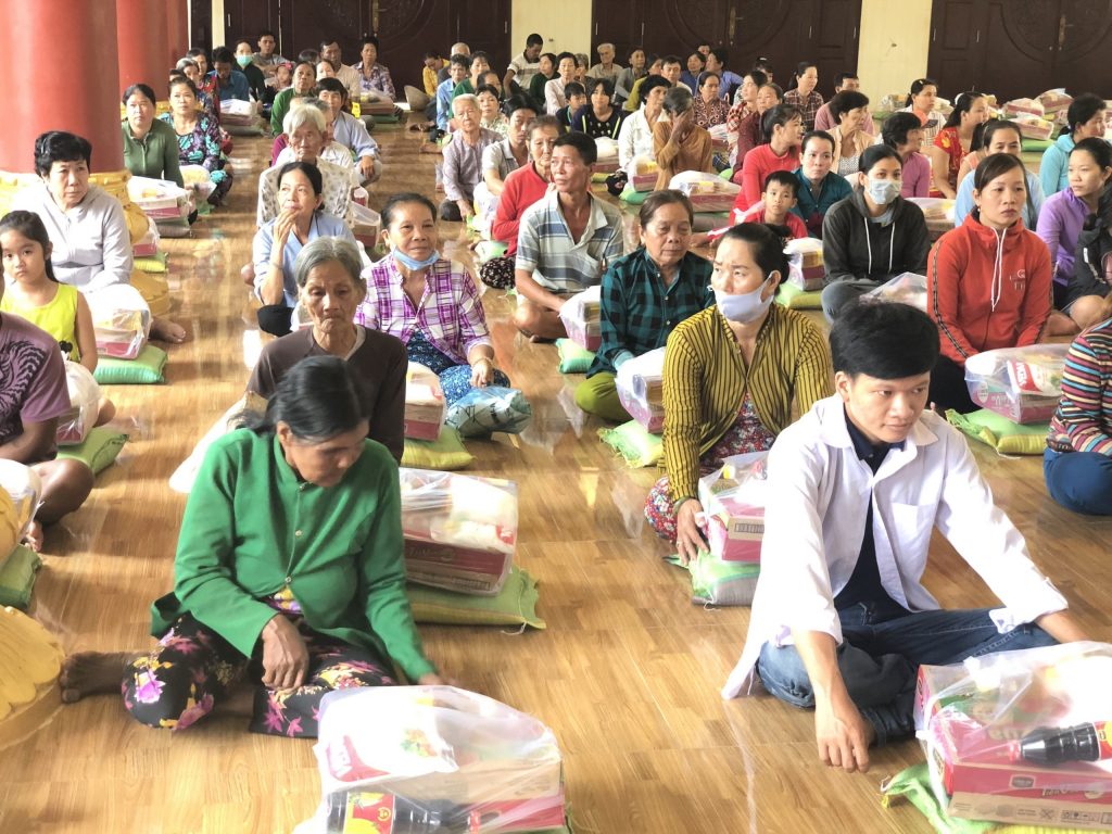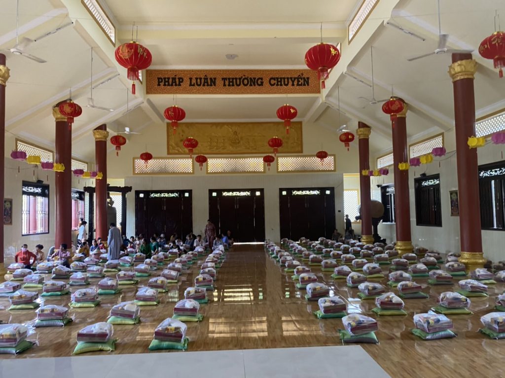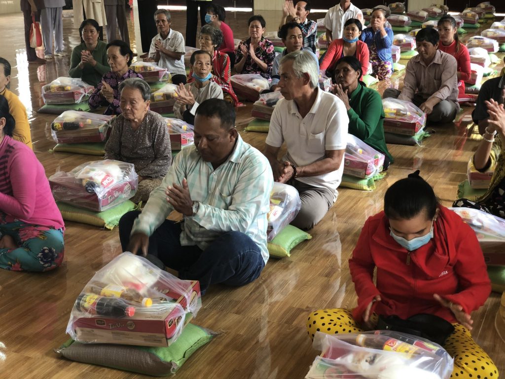 Tại Giảng đường chùa Thiên Thới gia đình trao tận tay cho bà con có hoàn cảnh khó khăn 200 phần quà, mỗi phần trị giá 250.000đ (gồm 10 ký gạo, 1 thùng mì và các thực phẩm khác).
