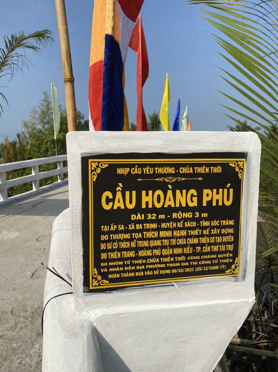 Cầu Hoàng Phú được xây dựng giáp liền ranh giới giữa tỉnh Sóc Trăng và Hậu Giang. Kích thước dài 30 mét, rộng 3 mét, tải trọng tối đa 2 tấn, tọa lạc tại ấp 5A, xã Ba Trinh, huyện Kế Sách, tỉnh Sóc Trăng (bên kia cầu là TX.Ngã Bảy, tỉnh Hậu Giang). Cầu được HT.Thích Minh Hạnh thiết kế kỷ thuật và chỉ đạo thực hiện. SC.Thích Nữ Trung Quang - Trụ trì chùa Chánh Thiên Cơ giới thiệu gia đình Thiên Trang - Hoàng Phú (TP.Cần Thơ) tài trợ kinh phí vật tư. Nhóm từ thiện chùa Thiên Thới và nhân dân địa phương đồng thi công xây dựng. Tổng giá trị của cầu Hoàng Phú là 340 triệu đồng.