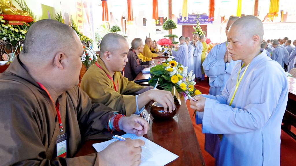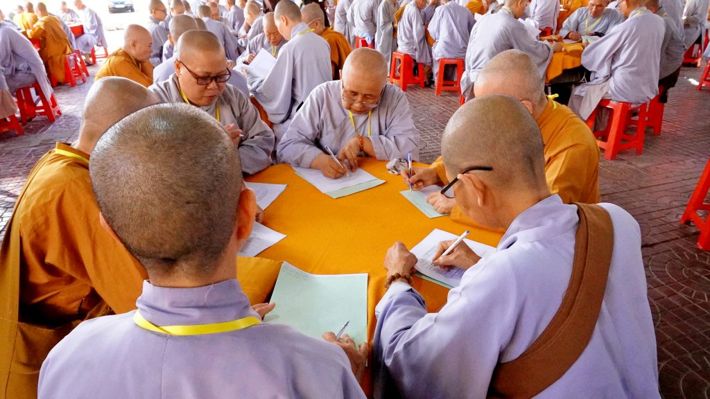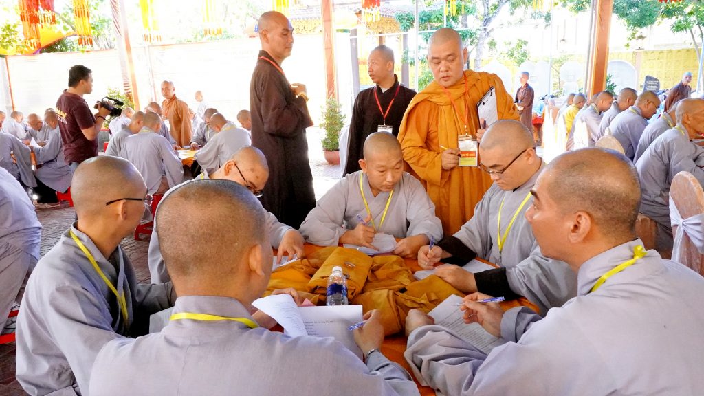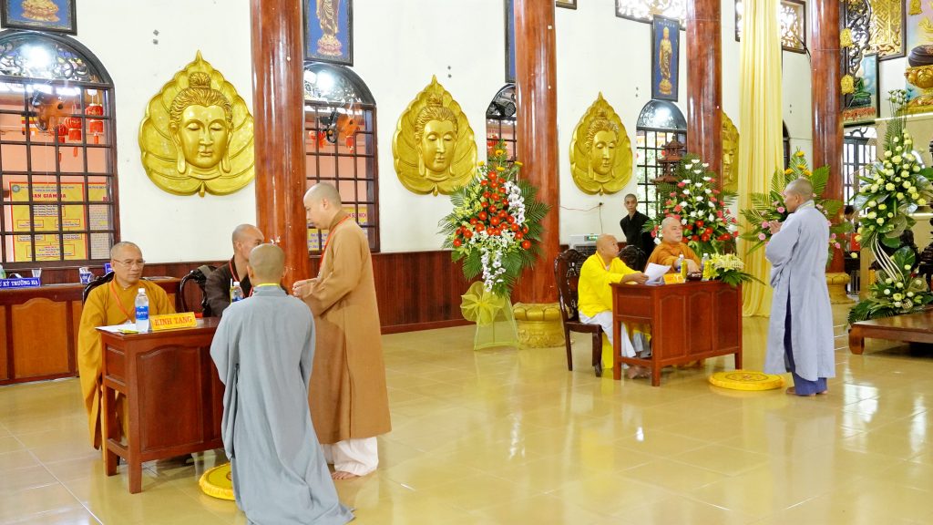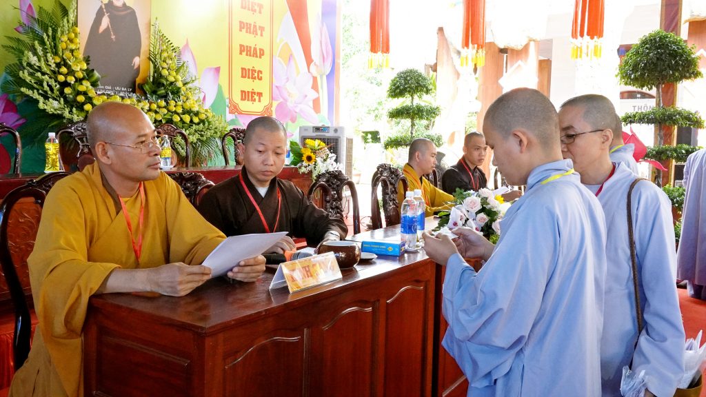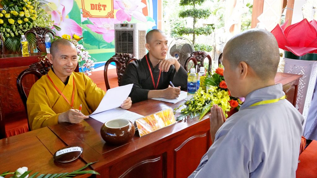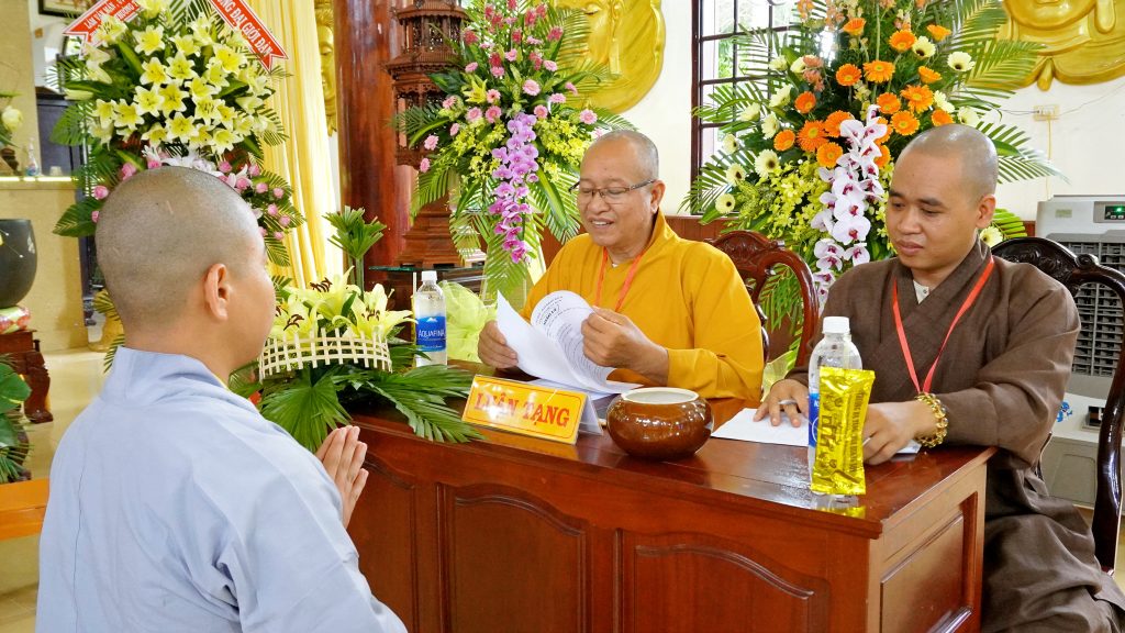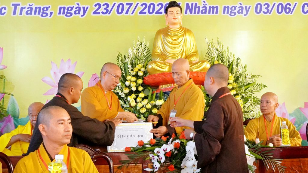 Sau đó, chư Tôn đức đại diện Ban tổ chức khai đề thi và phát đề cho các giới tử. Các giới tử nghiêm túc làm bài trắc nghiệm và khảo thí trực tiếp từ chư Tôn đức Chủ khảo qua các môn Kinh, Luật, Luận.
