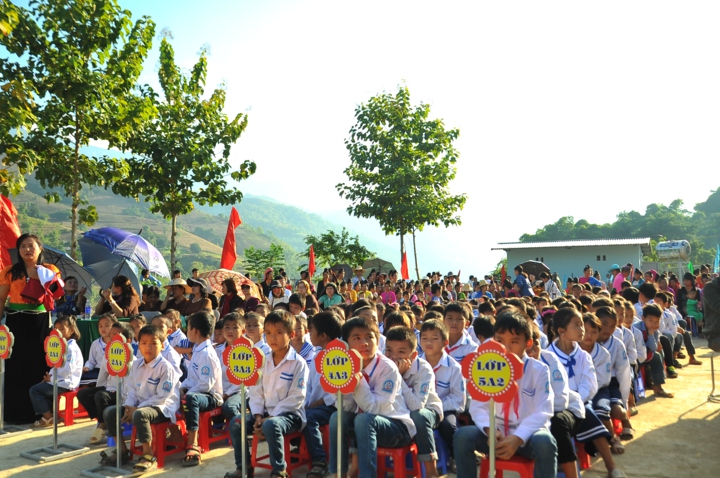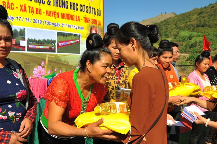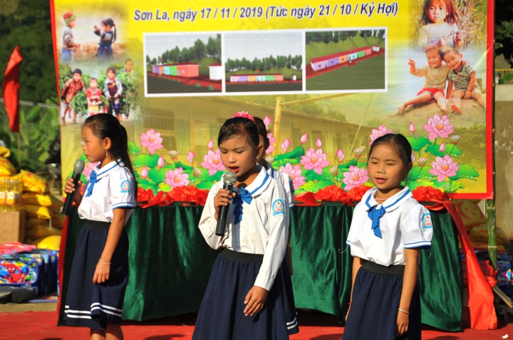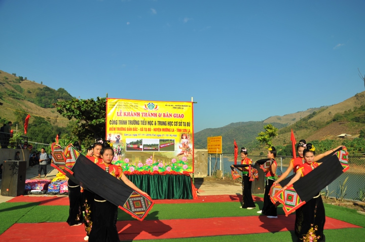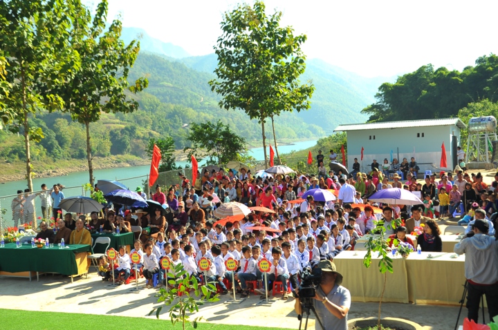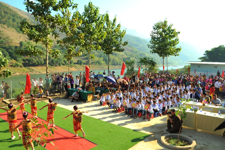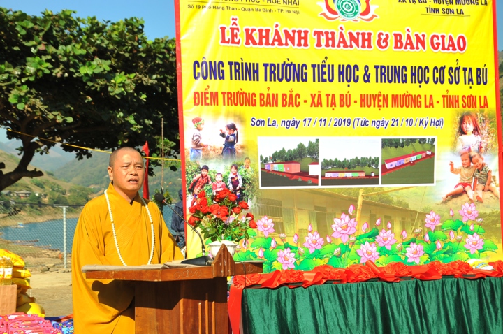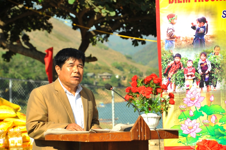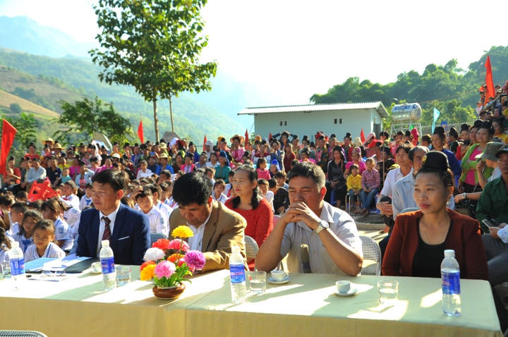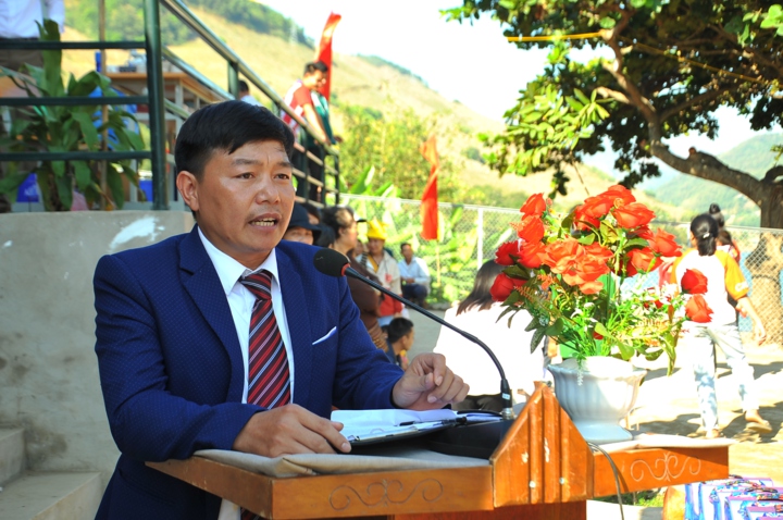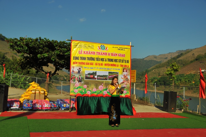 Bà Hoàng Thị Lợi hiệu trưởng Trường Tiểu Học và Trung Học Cơ Sở Tạ Bú phát biểu tại buổi lễ