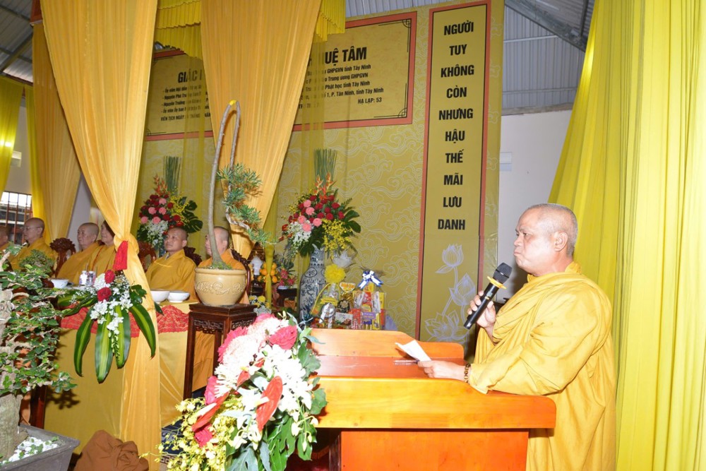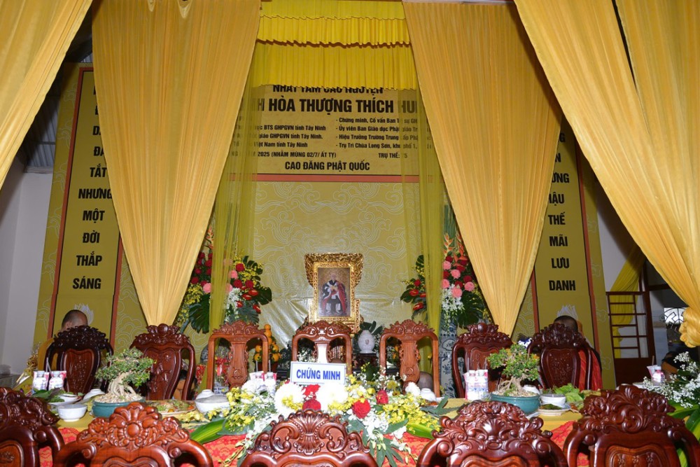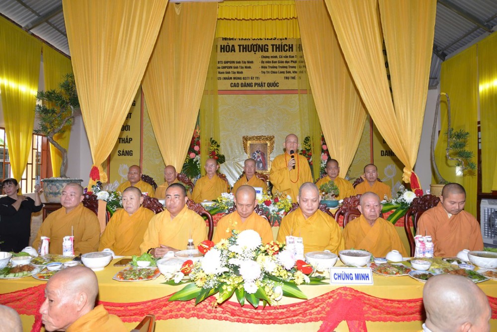 Quang lâm chứng minh và tham dự buổi lễ có: Hòa thượng Thích Thiện Tài - Chứng minh BTS GHPGVN tỉnh Tây Ninh; Hòa thượng Thích Minh Thiện – Ủy viên (UV) Hội đồng Trị sự (HĐTS), Phó ban Hoằng pháp TW, Chứng minh, Cố vấn BTS GHPGVN tỉnh; Hòa thượng Thích Thiện Thới – Chứng minh BTS GHPGVN tỉnh; Thượng tọa Thích Quảng Tâm – UV HĐTS, Phó ban Từ thiện Xã hội TW, Trưởng BTS GHPGVN tỉnh, Trưởng Ban Tổ chức; Thượng tọa Thích Thiện Thức – UVDK HĐTS, Phó Trưởng ban Thường trực BTS GHPGVN tỉnh; Đại đức Thích Lệ Duyên – Phó Ban kiêm Chánh Thư ký BTS GHPGVN tỉnh; Đại đức Thích Nguyên Tấn - Phó BTS GHPGVN tỉnh; Ni trưởng Thích nữ Như Tâm - Phó BTS kiêm Trưởng Phân ban Ni giới GHPGVN tỉnh; Chư Tôn đức BTS GHPGVN tỉnh Tây Ninh, Chư Tôn đức Tăng Ni trong và ngoài tỉnh đồng quang lâm chứng minh, tham dự.