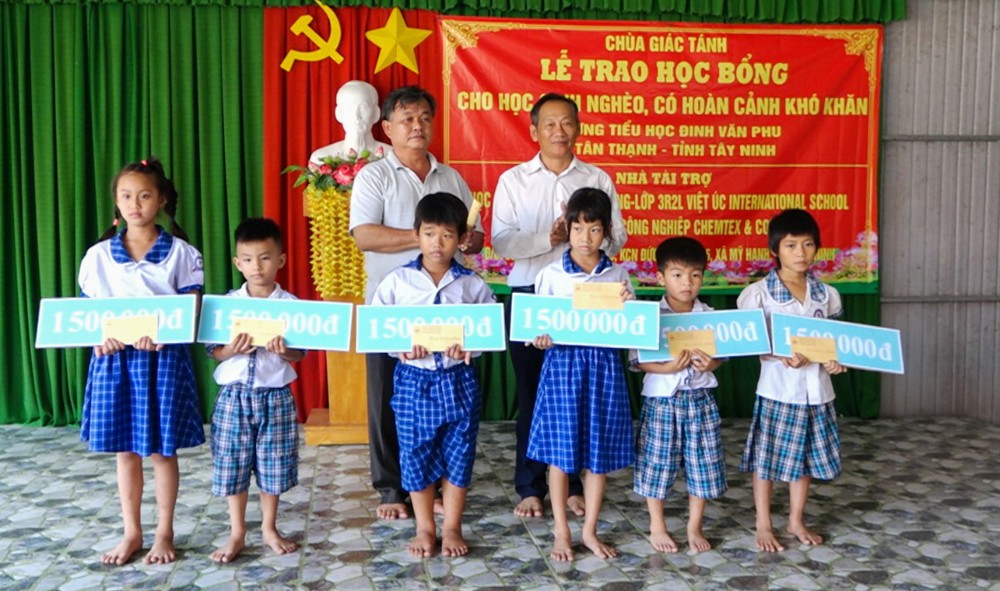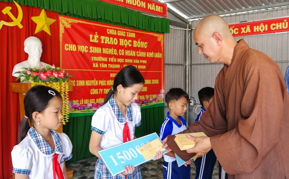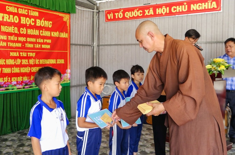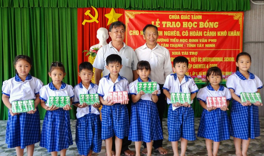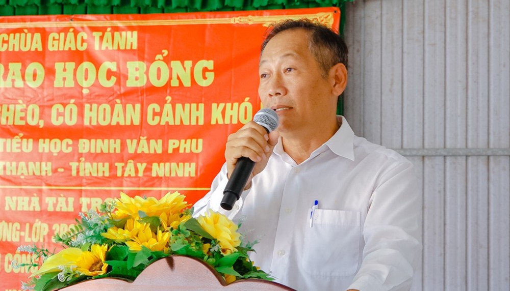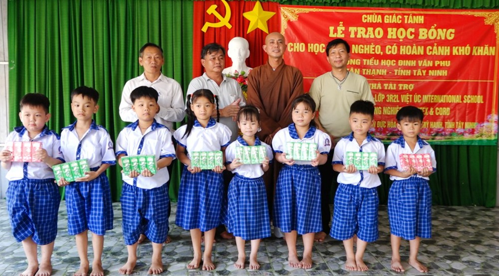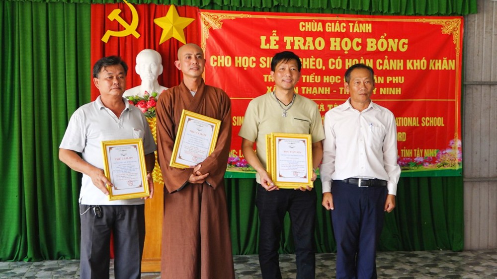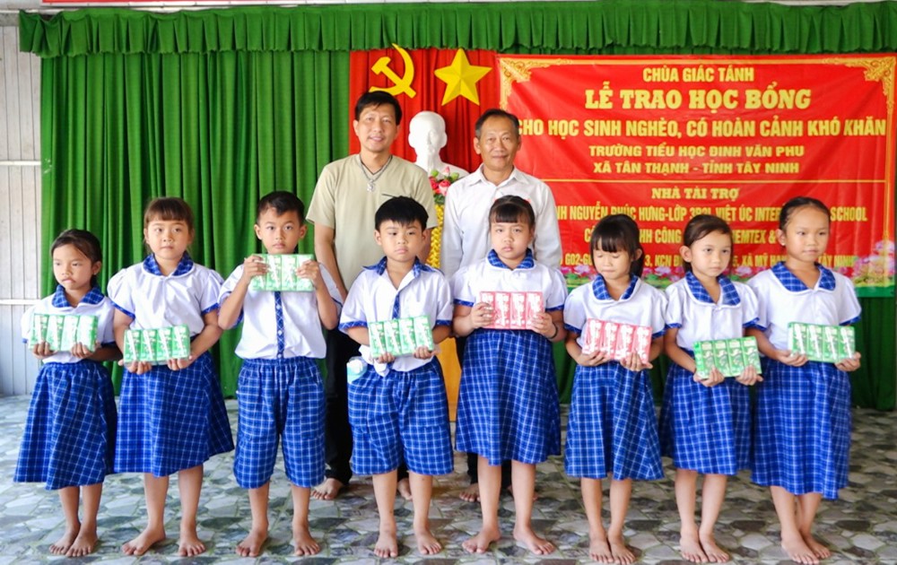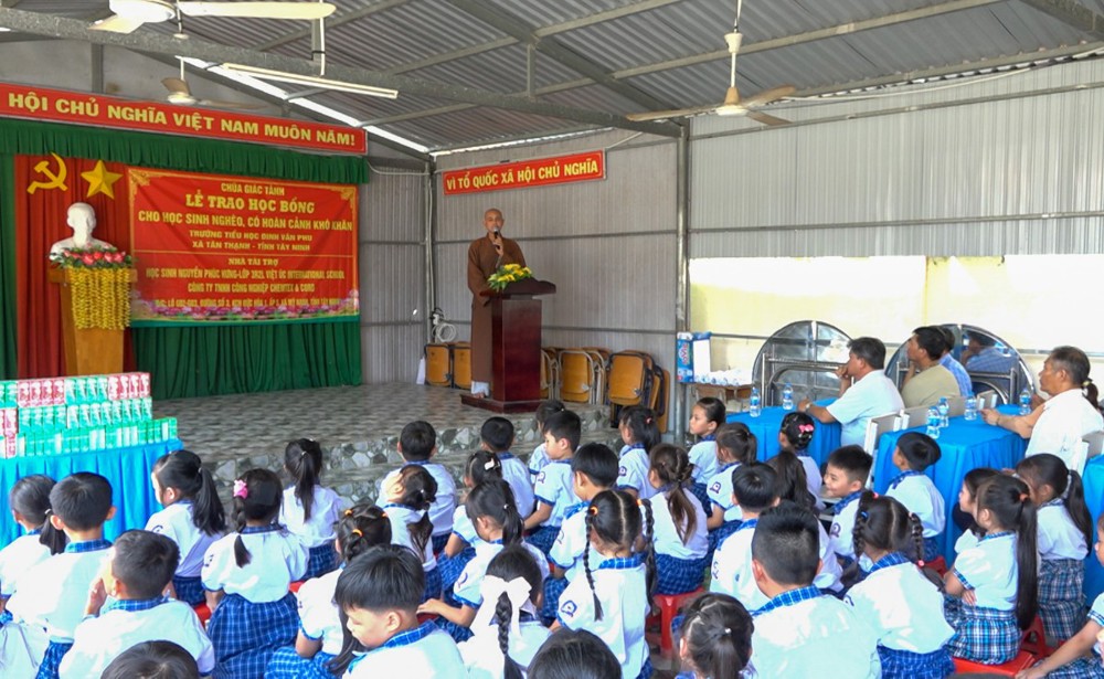 Sáng ngày 27/10/2025, tại Trường Tiểu học Đinh Văn Phu (xã Tân Thạnh, tỉnh Tây Ninh), Chùa Giác Tánh (phường Tân Hòa, TP.HCM) đã tổ chức Lễ trao học bổng cho học sinh nghèo, có hoàn cảnh khó khăn, nhằm khuyến khích tinh thần hiếu học và sẻ chia yêu thương đến các em học sinh vùng nông thôn còn nhiều thiếu thốn.