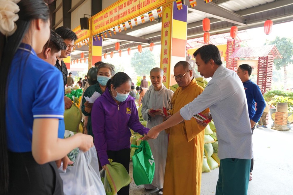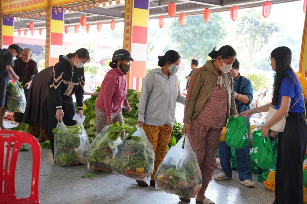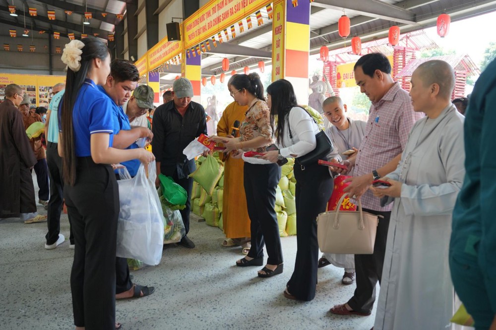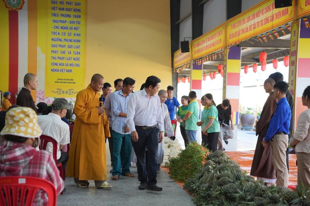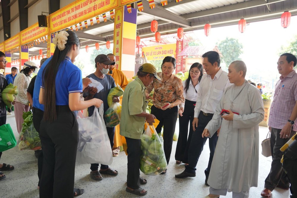 Sau phần nghi thức hành chính, chư tôn đức và quý lãnh đạo chính quyền đã quang lâm khu vực bày trí vật phẩm, chính thức khai mạc Phiên chợ 0 đồng.