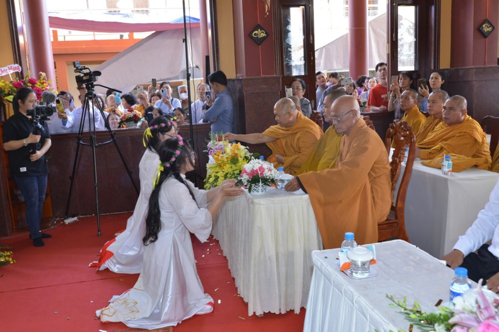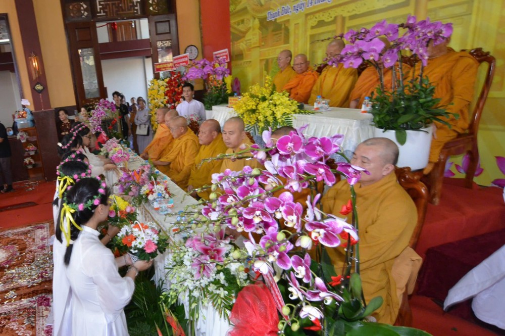 Các em gia đình Phật tử Tịnh xá Ngọc Đức thành kính dâng hoa cúng dường Chư Tôn Đức .