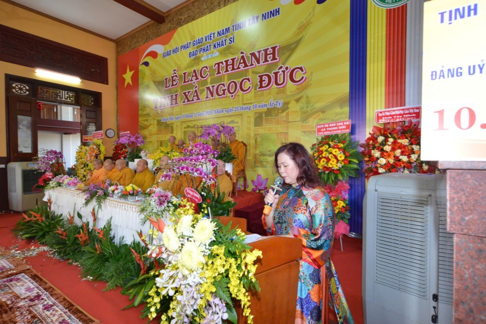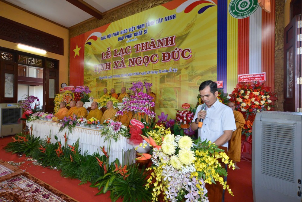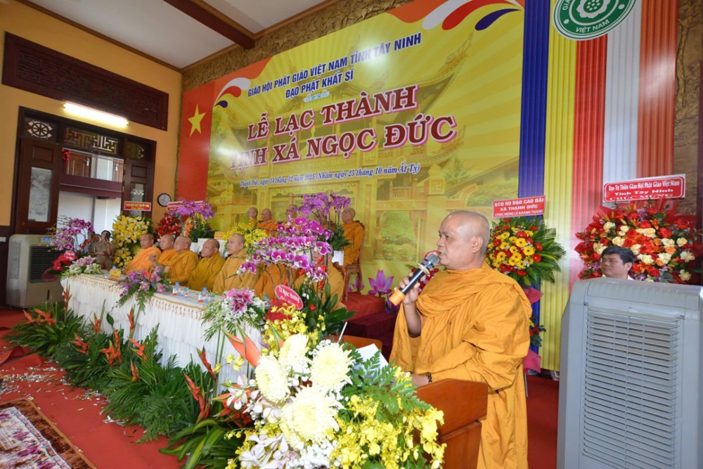 Ni sư Hạnh Liên – UVTT kiêm Phó Trưởng PBNG GHPGVN tỉnh Tây Ninh, Trụ trì Tịnh xá Ngọc Đức, Trưởng BTC có lời phát biểu chào mừng Chư Tôn Đức Tăng Ni, Chính quyền các cấp, Chư Phật tử gần xa đã quang lâm và đến tham dự Đại lễ Khánh thành. Ni sư cũng khái quát sơ lược sự hình thành và phát triển của Tịnh xá Ngọc Đức: “ Tịnh xá Ngoc Đức tiền thân là Chùa Quan Âm do Thân sinh Thượng tọa Thích Định Tánh thành lập. Sau khi Thân sinh Thượng tọa Định Tánh qua đời, gia đình Thầy Định Tánh cung thỉnh Ni sư Hạnh Liên và giao Chùa Quan Âm vào năm 2010 để Ni sư chăm lo Phật sự. Trải qua thời gian, Chùa Quan Âm được chuyển thành Tịnh xá Ngọc Đức vào năm 2015. Năm 2017, Ni sư Hạnh Liên chính thức Đặt đá xây dựng Tịnh xá mới hoàn toàn ”.