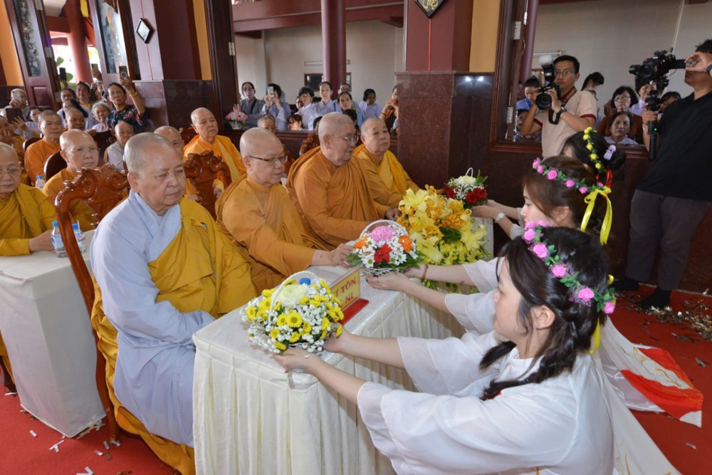 Ni sư Hạnh Liên đón nhận nhiều lẵng hoa, phần quà chúc mừng của Chư Tôn Đức.