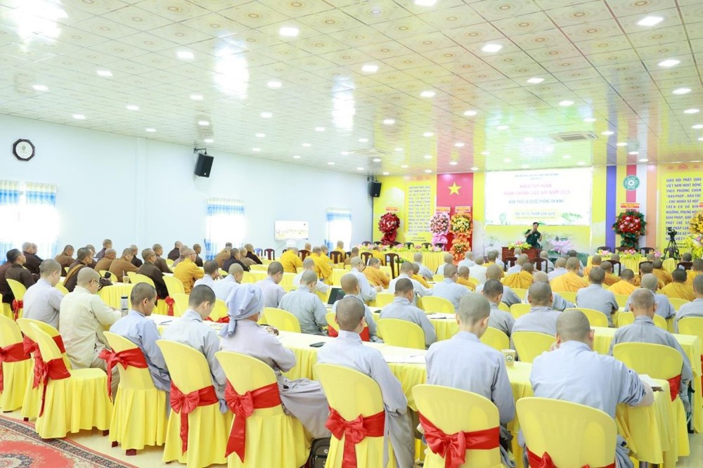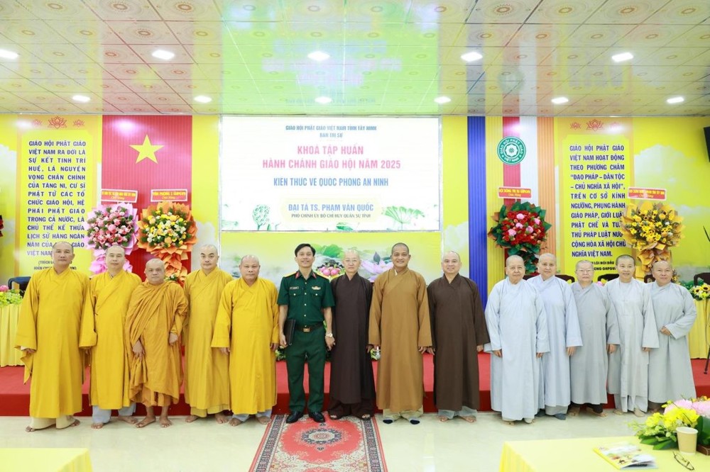 Sáng ngày 26/11/2025, theo chương trình Khóa tập huấn Hành chánh Giáo hội năm 2025 do BTS GHPGVN tỉnh Tây Ninh tổ chức từ ngày 24 – 26/11/2025 tại Trụ sở GHPGVN tỉnh, buổi học sáng là phần chia sẻ của Đại tá, Tiến sĩ Phạm Văn Quốc – Phó Chính ủy Bộ Chỉ huy Quân sự tỉnh Tây Ninh – về kiến thức Quốc phòng – An ninh.