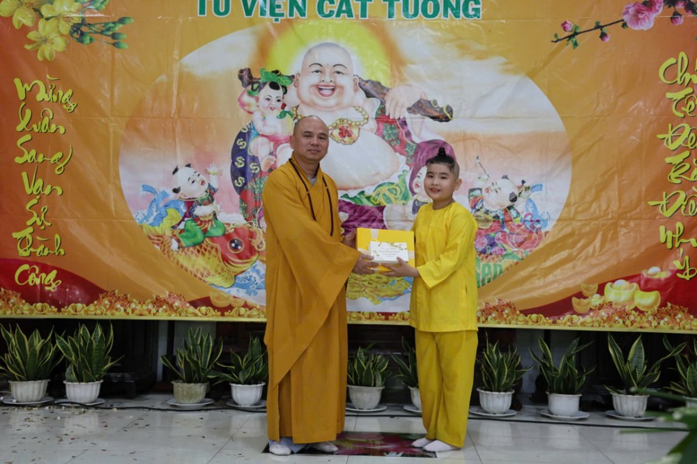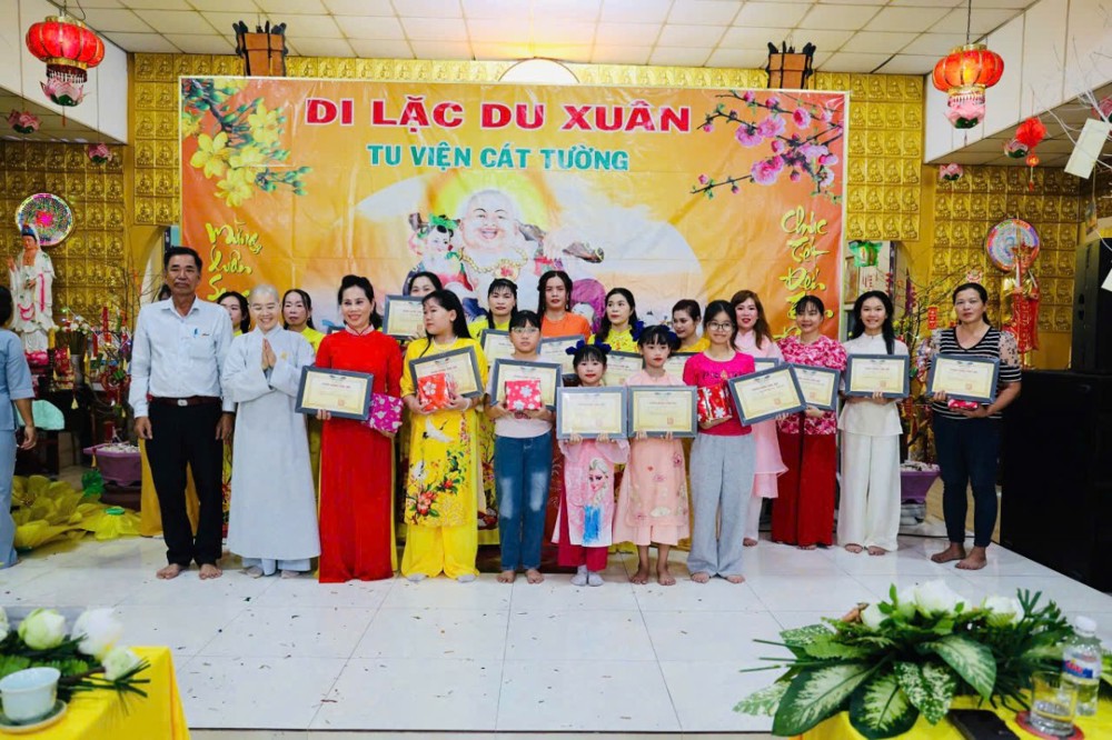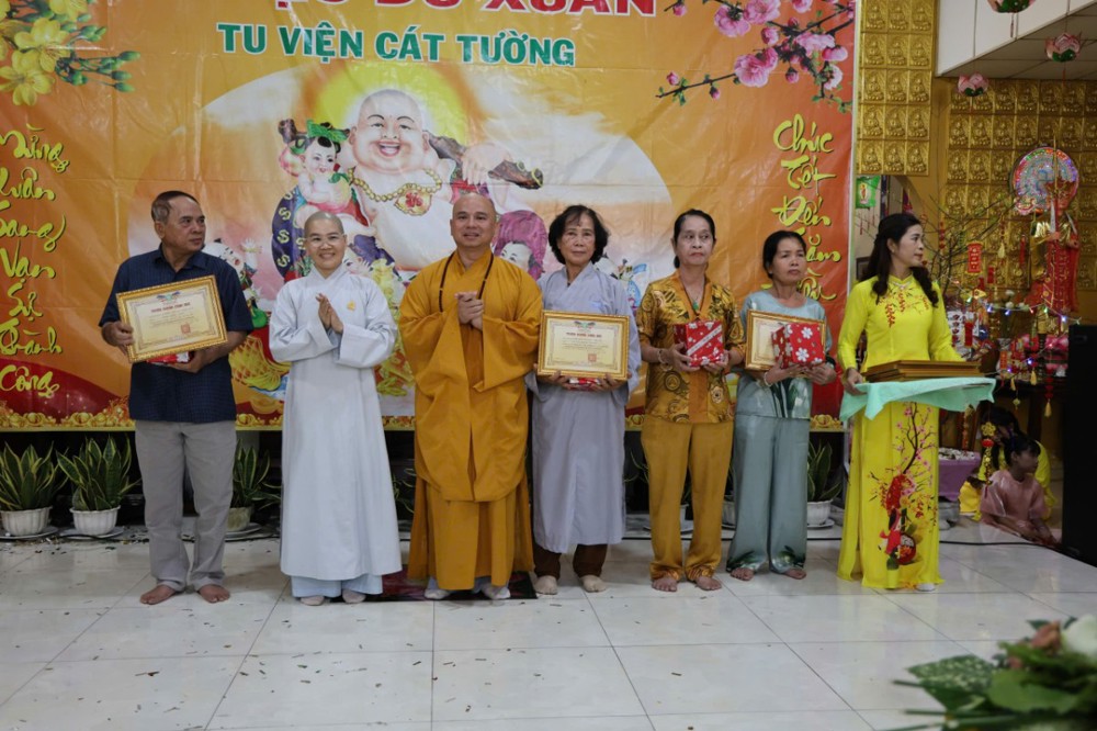 Chương trình văn nghệ vui xuân do các ca sĩ và Phật tử thể hiện đã tạo nên không khí ấm áp, gắn kết đạo tình trong tinh thần lục hòa. Đến 9 giờ, đạo tràng long trọng trao thưởng cho lớp học Kinh Trung Bộ và Gia giáo, đồng thời trao bằng khen đến các Phật tử tiêu biểu, ghi nhận tinh thần tinh tấn tu học và phụng sự Tam bảo. Hoạt động bốc thăm trúng thưởng quà xuân tiếp tục mang đến nhiều niềm vui, tiếng cười cho đại chúng.
