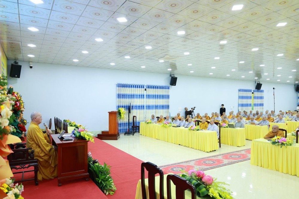 Trong phần chia sẻ về điều hành Phật sự trong thời công nghệ số, Hòa thượng nhấn mạnh rằng xã hội hiện đại đòi hỏi Giáo hội phải đổi mới phương thức quản trị. Nếu chỉ sử dụng giấy tờ hay thủ bút như trước đây thì dễ chậm trễ và thiếu chính xác; do đó, người lãnh đạo Giáo hội cần thành thạo các công cụ công nghệ như phần mềm quản lý dữ liệu Tăng Ni – tự viện – hoạt động từ thiện, các nền tảng trực tuyến như Drive, Gmail, Zoom, Zalo Work, cũng như hệ thống báo cáo điện tử nhằm tăng tính minh bạch và hiệu quả. Hòa thượng nêu ví dụ về BTS Phật giáo tỉnh Tây Ninh đã triển khai quản lý Phật sự online, giúp xử lý công việc nhanh gọn, chính xác và tiết kiệm nhân lực.