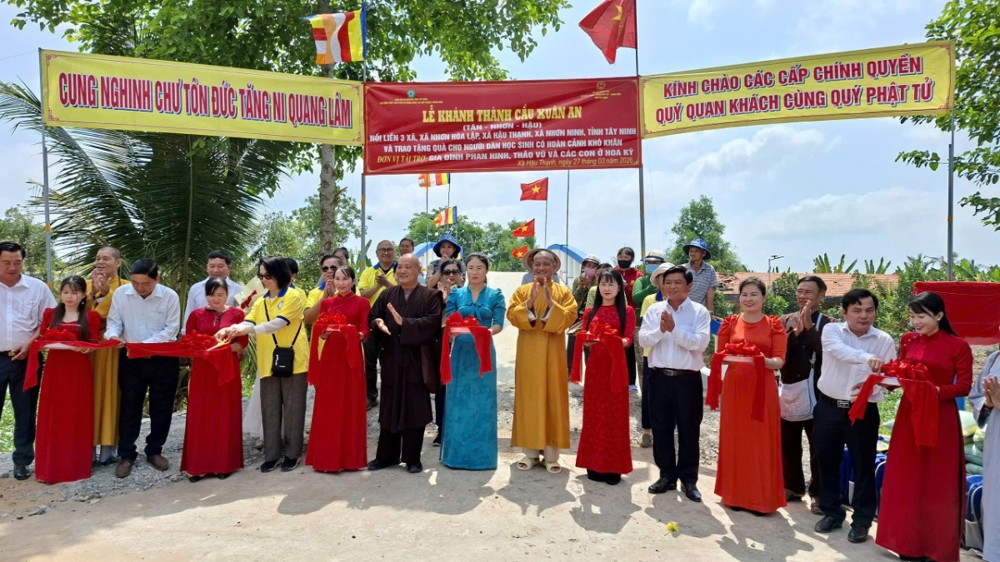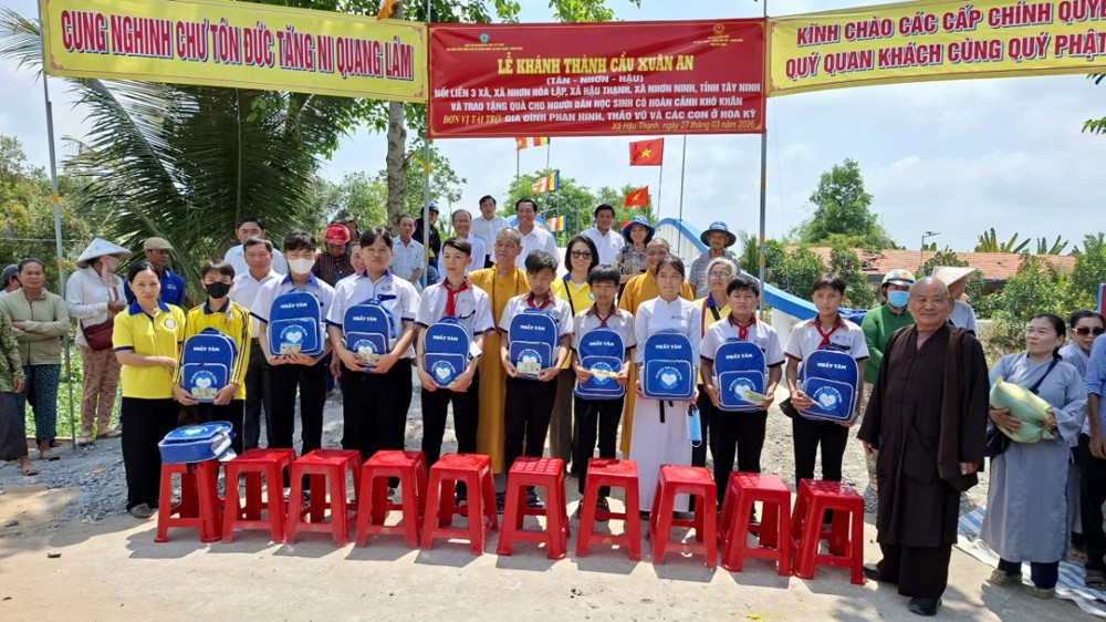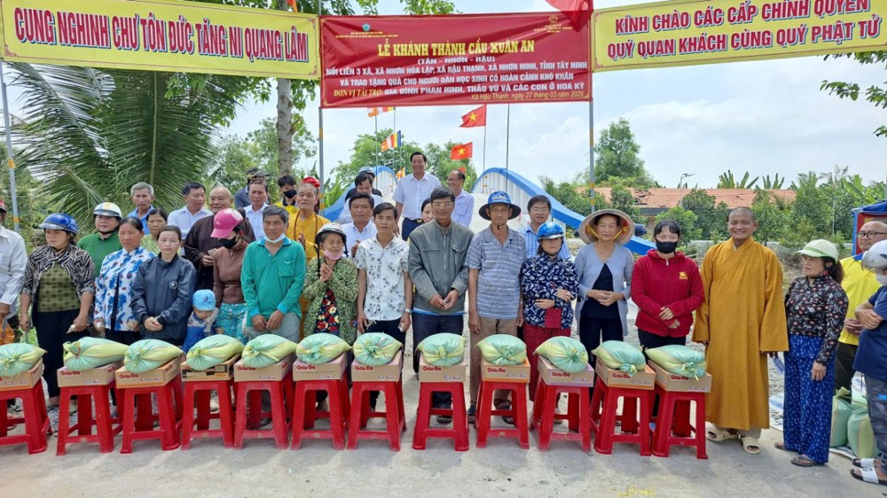 PSO - Sáng ngày 27/3/2026, tại tỉnh Tây Ninh, Ban Trị sự Giáo hội Phật giáo Việt Nam tỉnh Tây Ninh phối hợp cùng Ban Từ thiện Xã hội Báo Giác Ngộ và chính quyền địa phương đã long trọng tổ chức lễ khánh thành cầu Xuân An, đồng thời trao tặng 100 phần quà an sinh đến bà con có hoàn cảnh khó khăn.