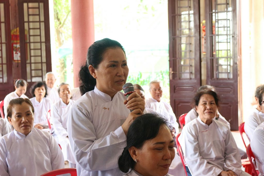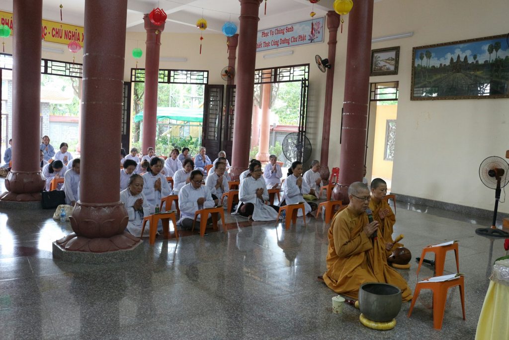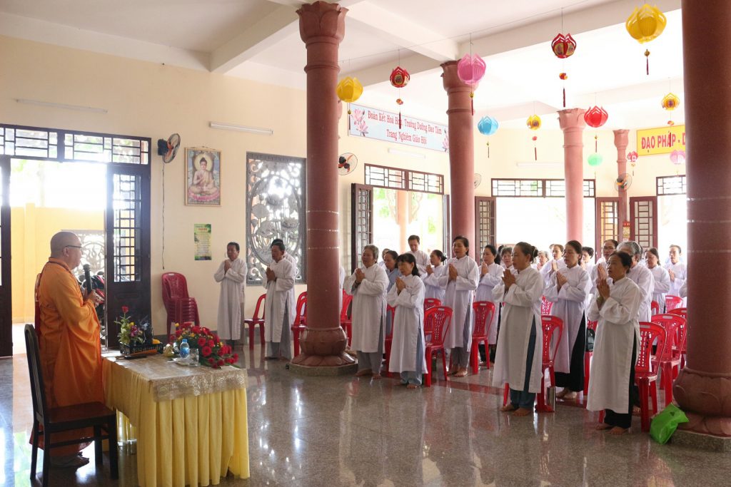 Buổi sáng, sau nghi thức truyền giới Bát Quan Trai, quý Phật tử vân tập về giảng đường để lắng nghe TT. Thích Nhuận Quang - Trụ trì chùa Nguyên Ngộ, Trưởng ban Hoằng pháp Quận 12, thành phố Hồ Chí Minh quang lâm pháp tòa thuyết giảng Phật pháp.