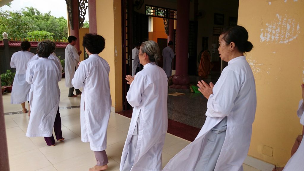 Ba vòng kinh hành với những bước đi thong thả trong tiếng niệm Phật A Di Đà mang đến sự trang nghiêm cho đạo tràng cũng là khép lại nửa ngày tu An lạc.