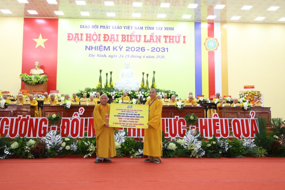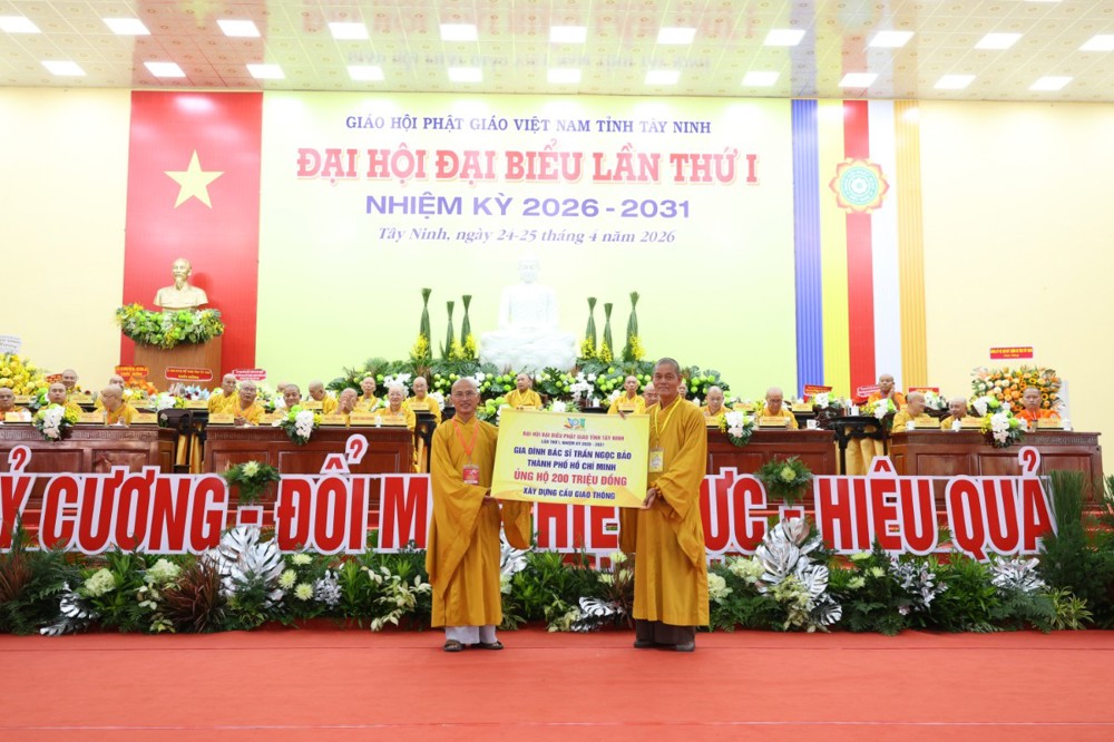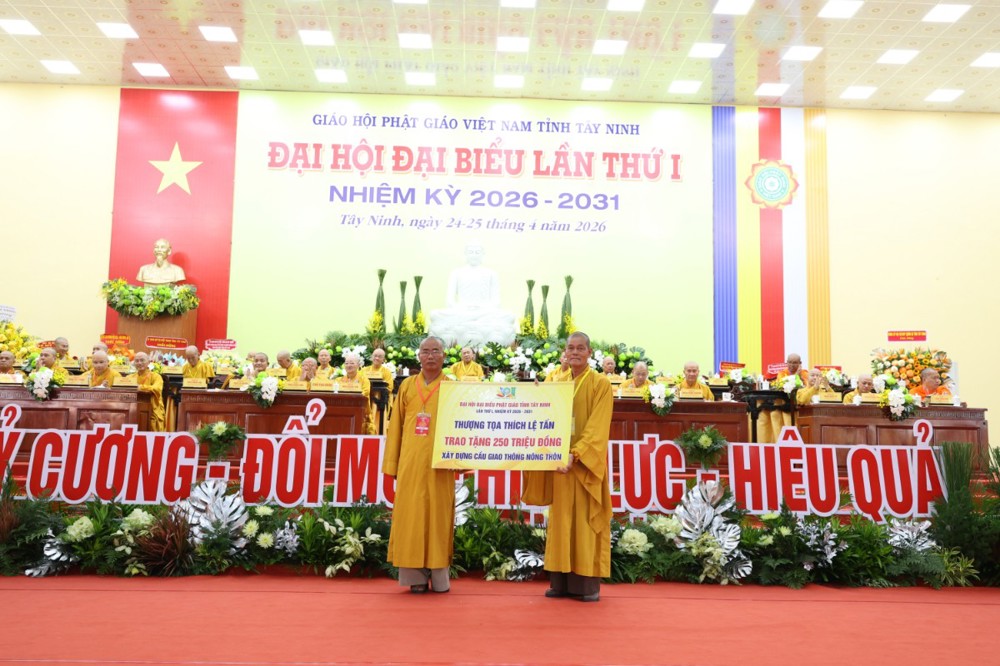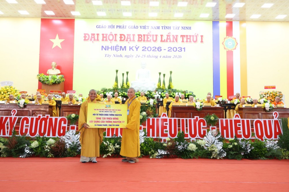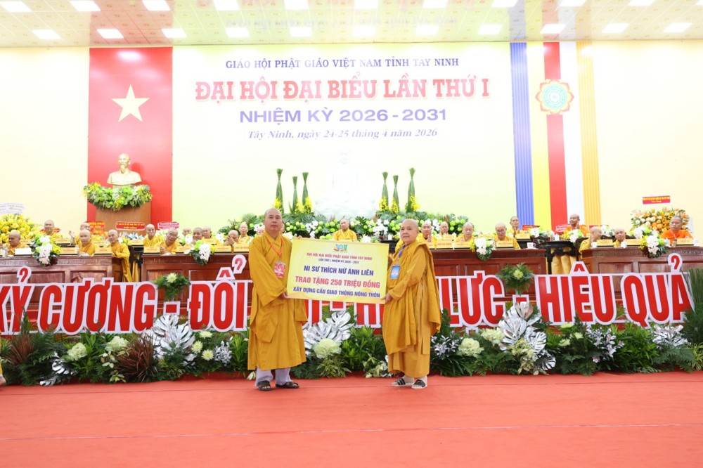 Trong khuôn khổ Đại hội, Ban Tổ chức đã tiếp nhận ủng hộ xây dựng các công trình giáo dục và giao thông nông thôn. Theo đó, Thượng tọa Thích Minh Phú ủng hộ 1,5 tỷ đồng xây dựng 3 phòng học tại xã Tân Đông và 720 triệu đồng xây cầu Tường Nguyên 577 tại xã Thạnh Phước; Thượng tọa Thích Lệ Tấn và Ni sư Thích nữ Ánh Liên, mỗi vị ủng hộ 250 triệu đồng xây cầu tại xã Hậu Thạnh và Tân Thạnh; Ni trưởng Thích Nữ Gương Liên trao tặng 70 triệu đồng xây dựng nhà Đại Đoàn Kết; Gia đình Bác sĩ Trần Ngọc Bảo trao tặng 200 triệu đồng xây dựng cầu giao thông nông thôn.